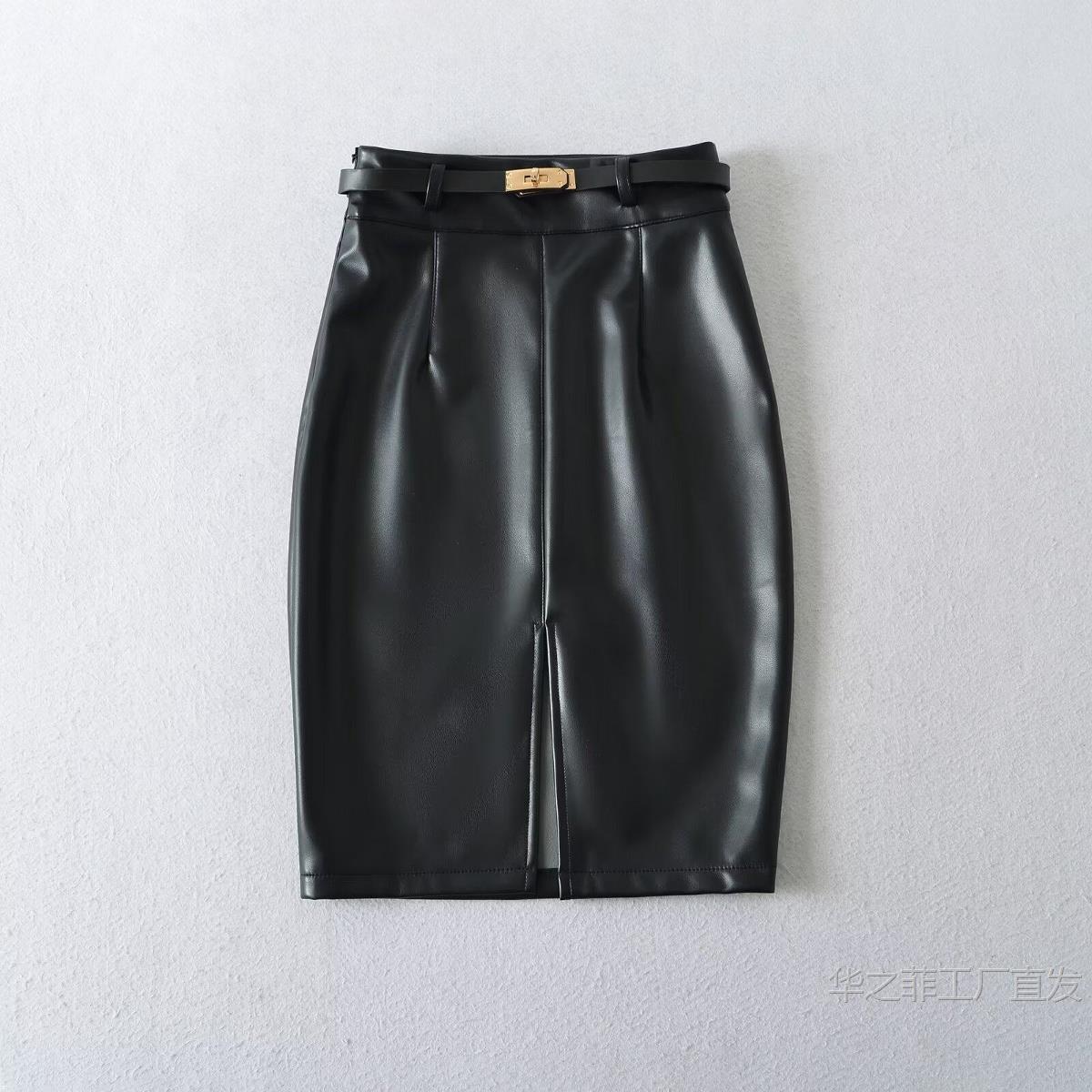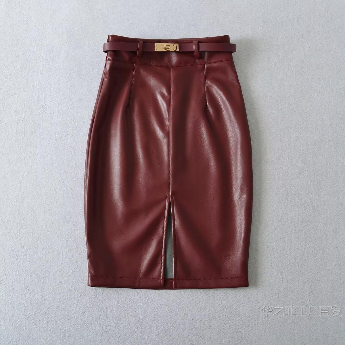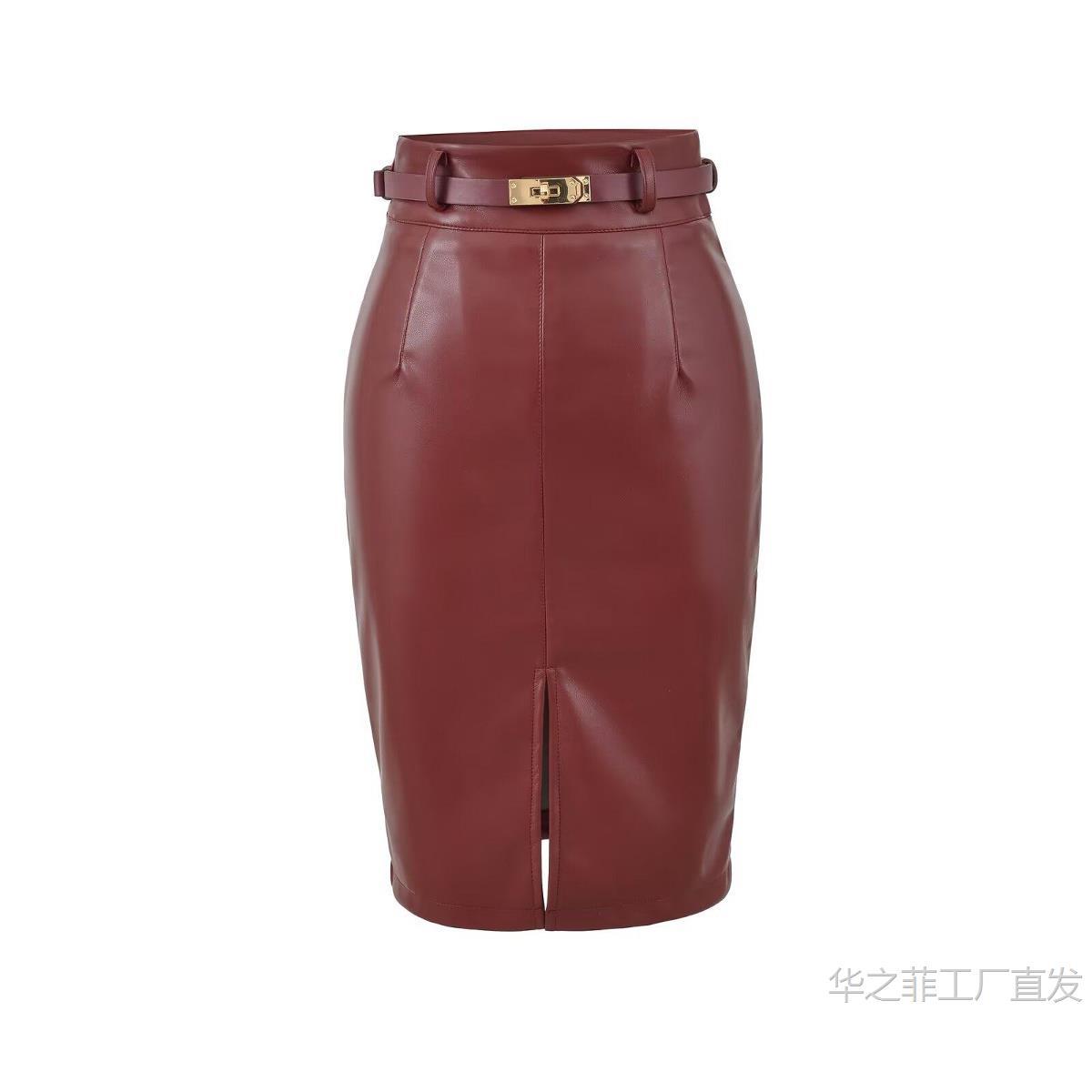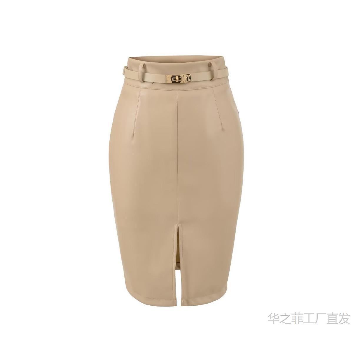 工厂直发 (含腰带)前开叉高腰修身皮裙女春秋季气质通勤显瘦半身