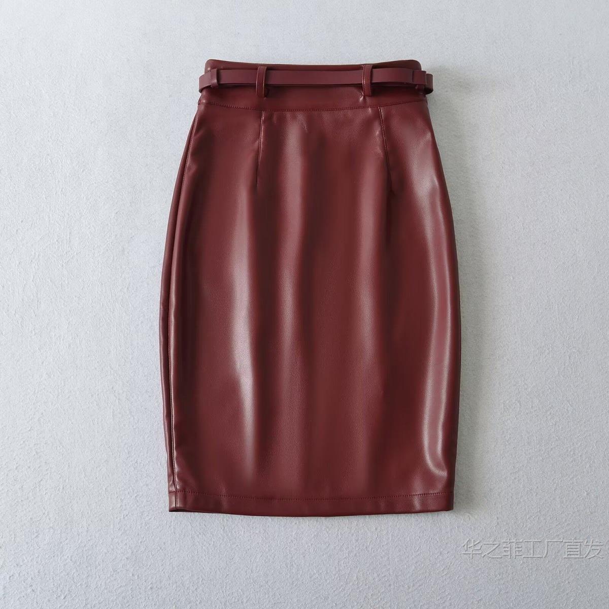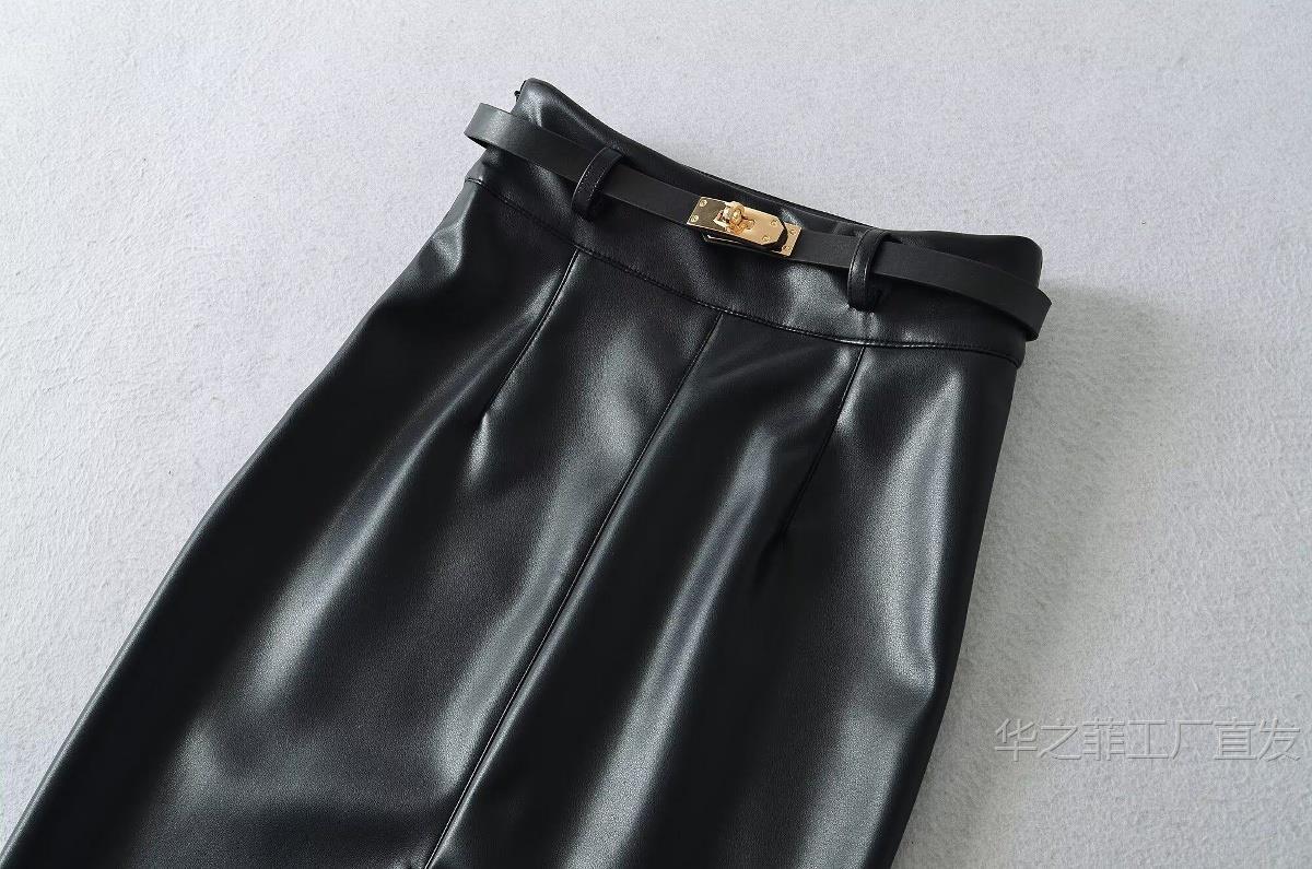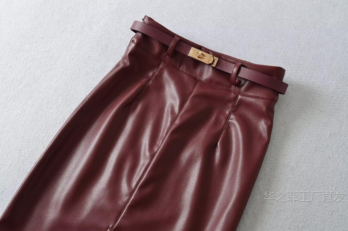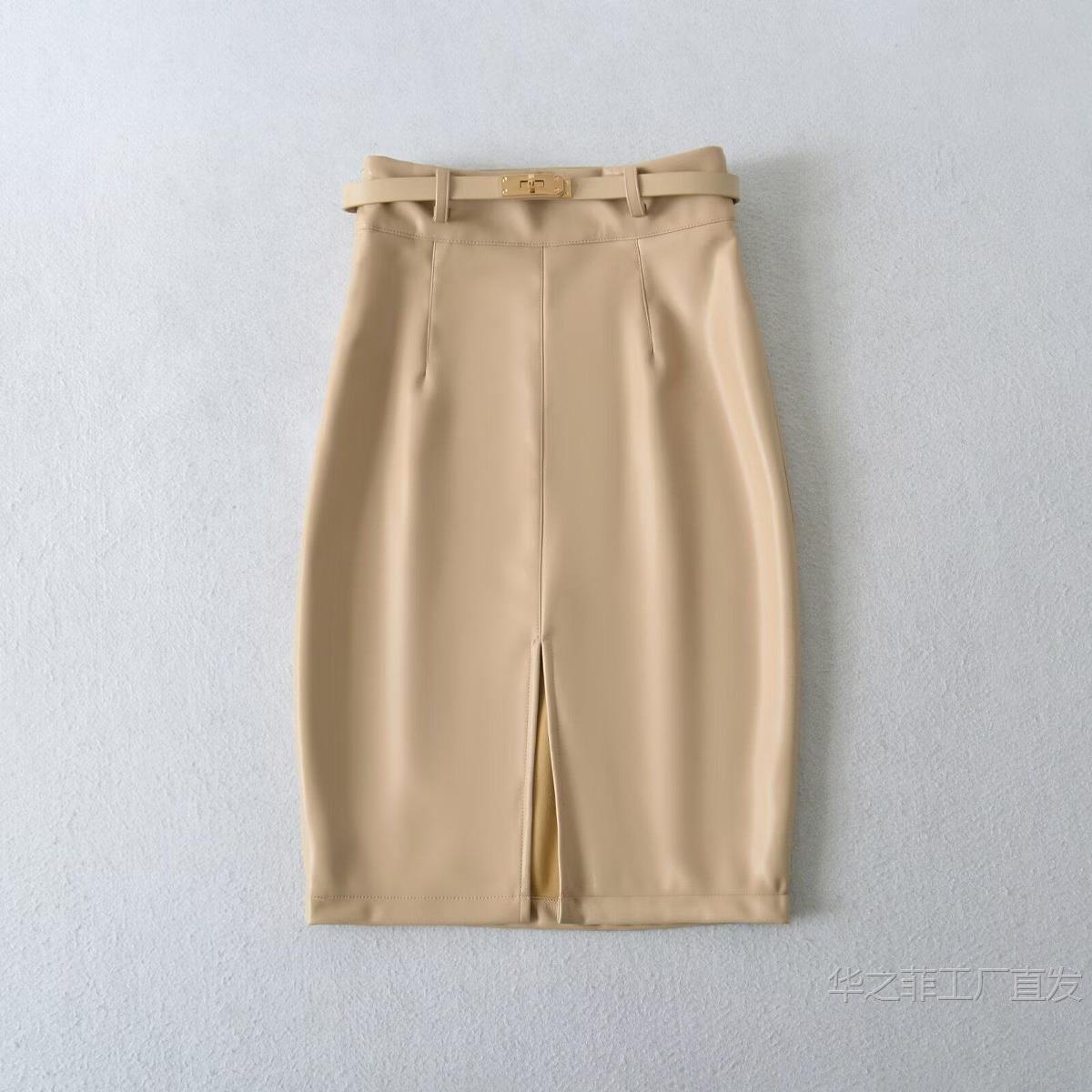 工厂直发 (含腰带)前开叉高腰修身皮裙女春秋季气质通勤显瘦半身