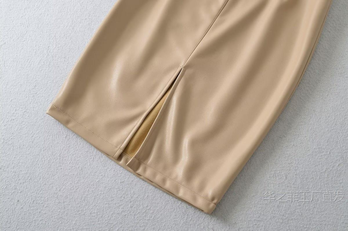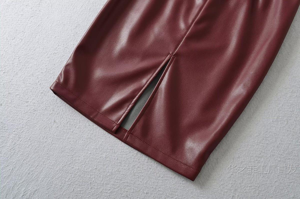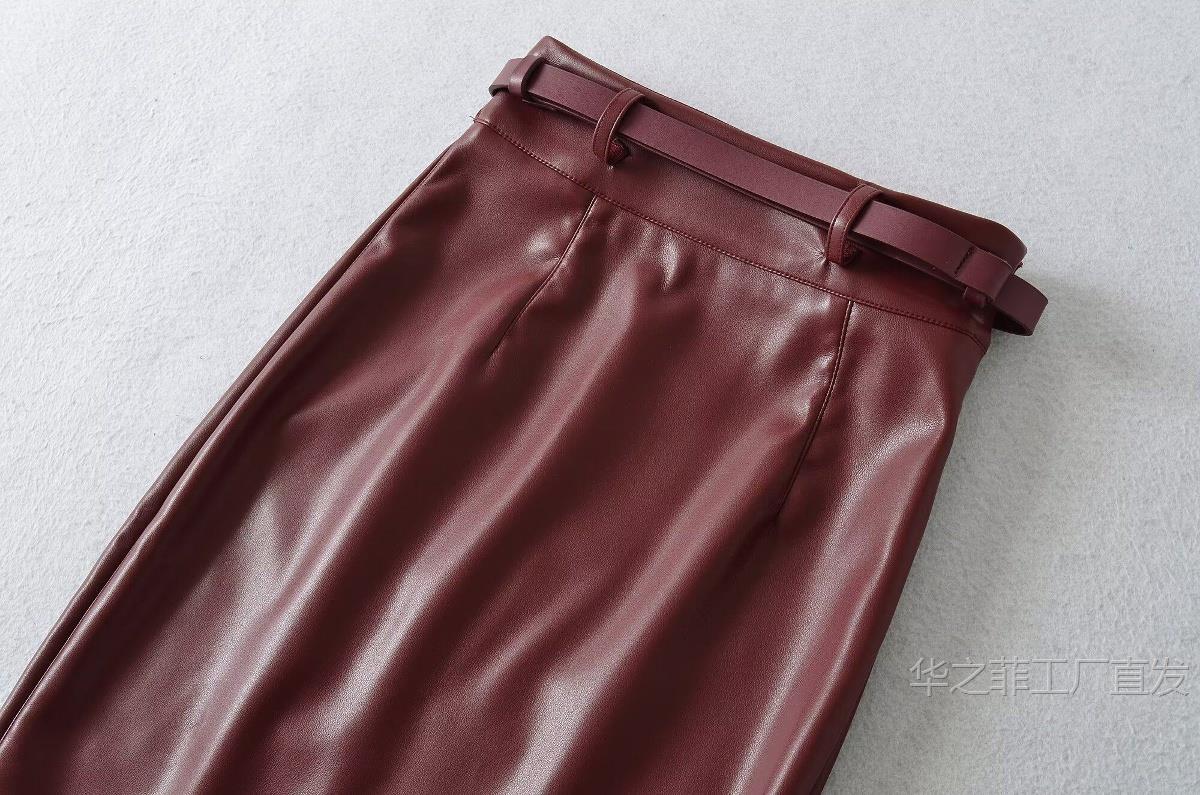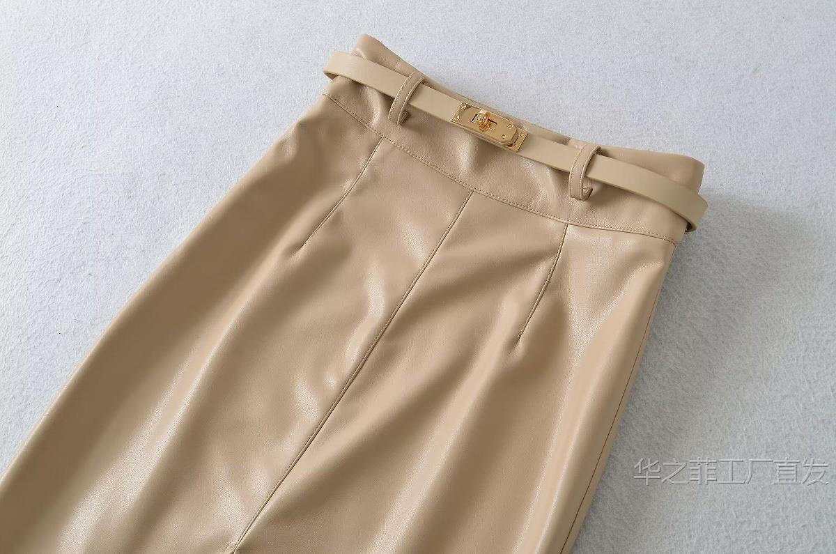 工厂直发 (含腰带)前开叉高腰修身皮裙女春秋季气质通勤显瘦半身