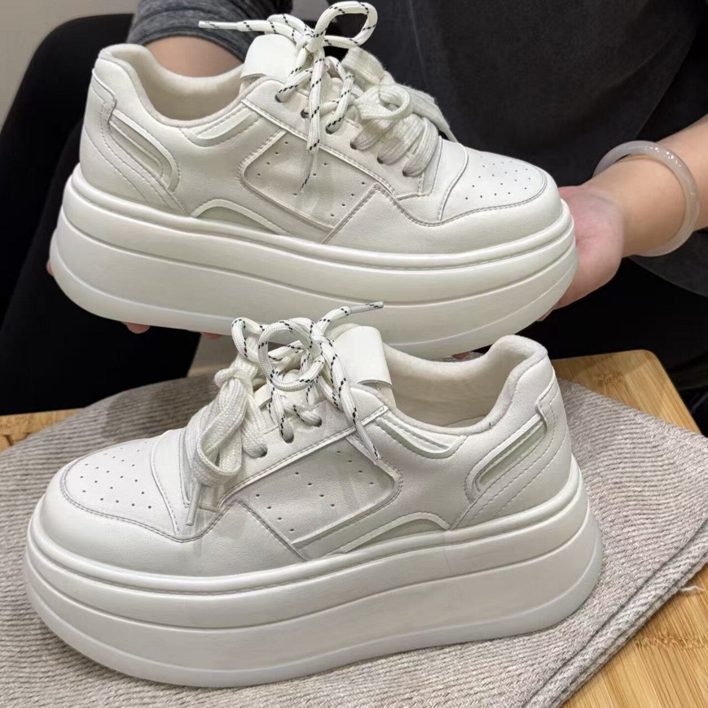 【+LYガロア】さようなら1.5m~ソフトレザー厚底増高プラットフォームカジュアルスニーカー女性用白靴