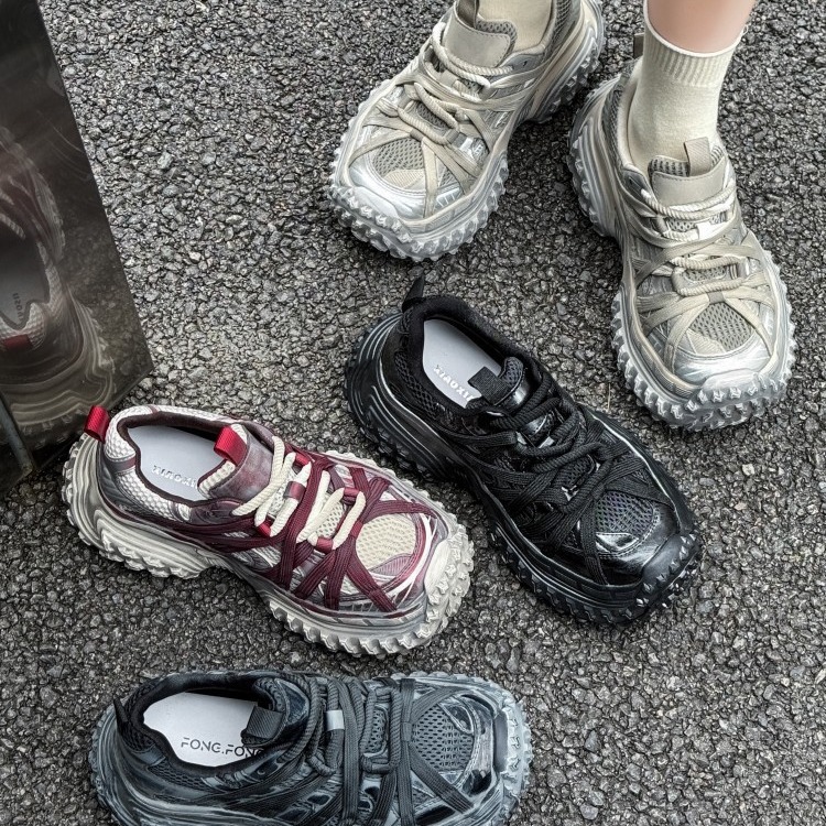 Bajia Spider Daddy シューズ レディース 2024 ソフトレザー レトロ ダメージ加工 ダートタイヤ ドリアン 厚底 カジュアル スポーツシューズ トレンド