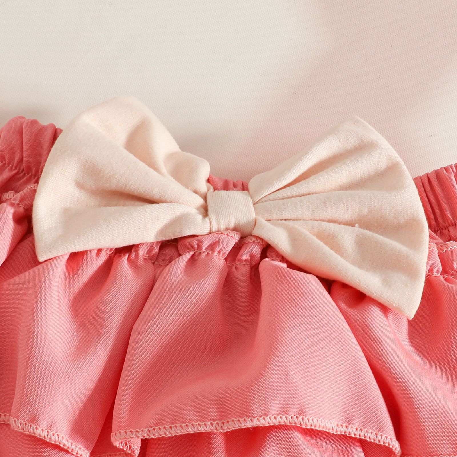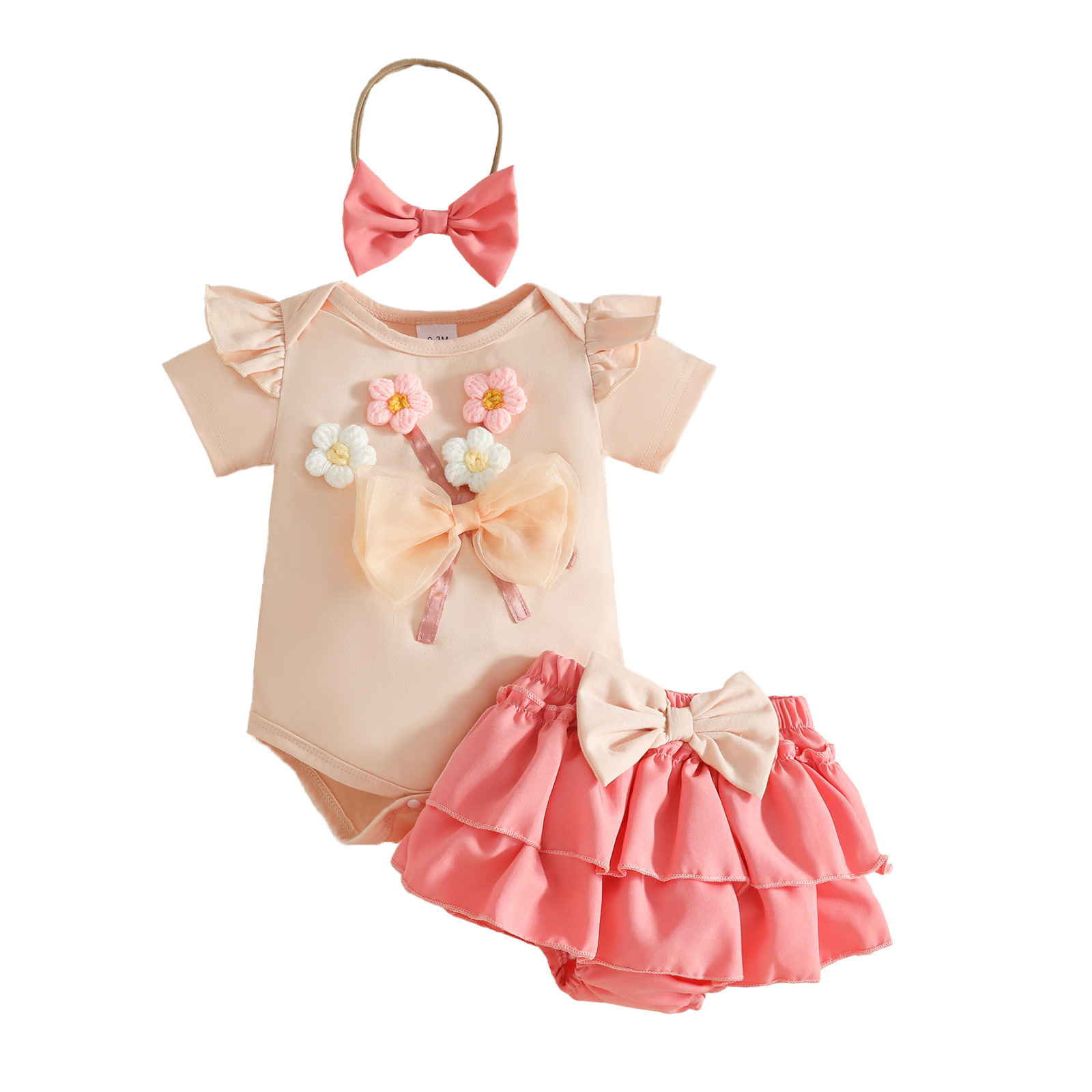 跨境欧美夏0-3岁女童短袖短裤套装坑条花朵蝴蝶结上衣褶皱裙裤帽