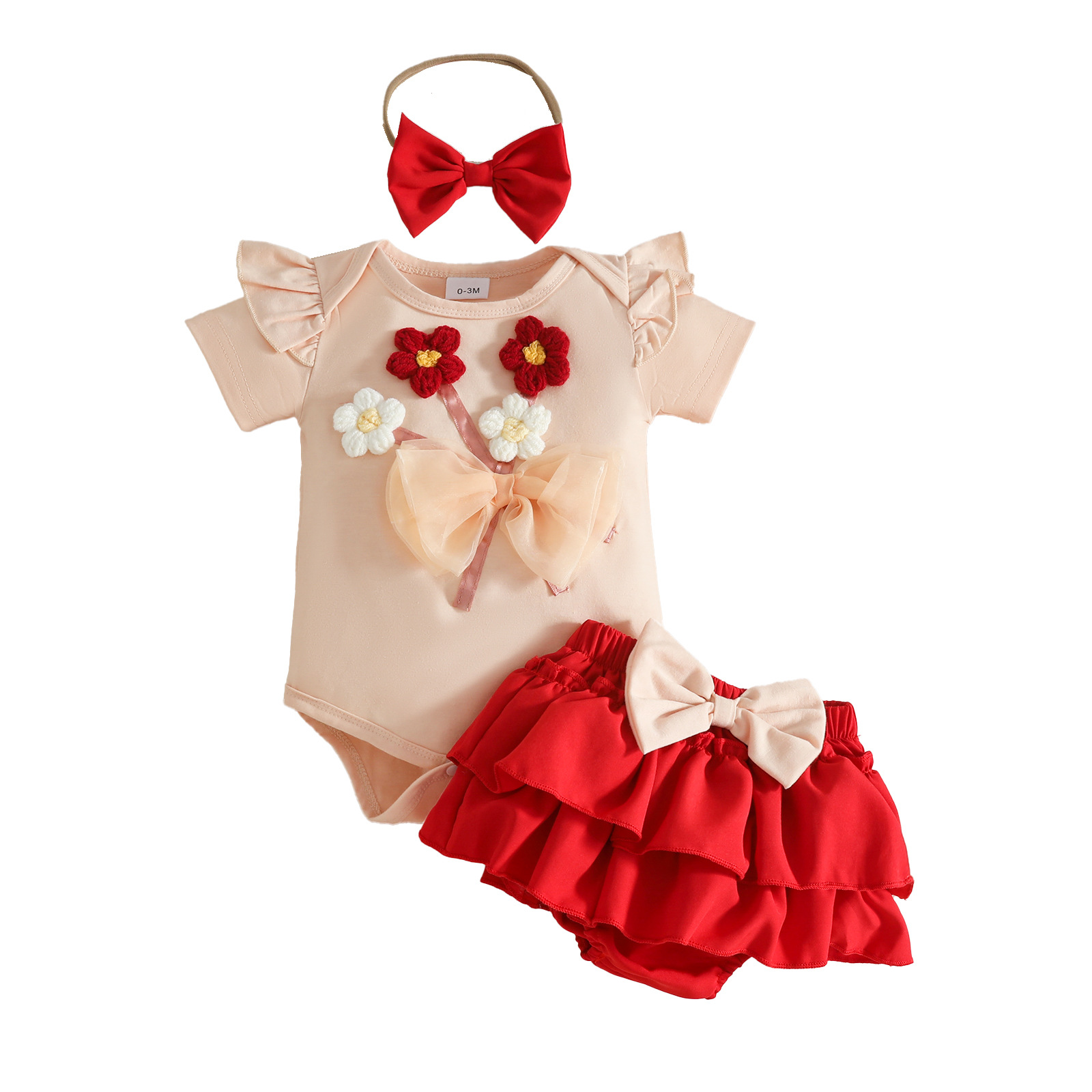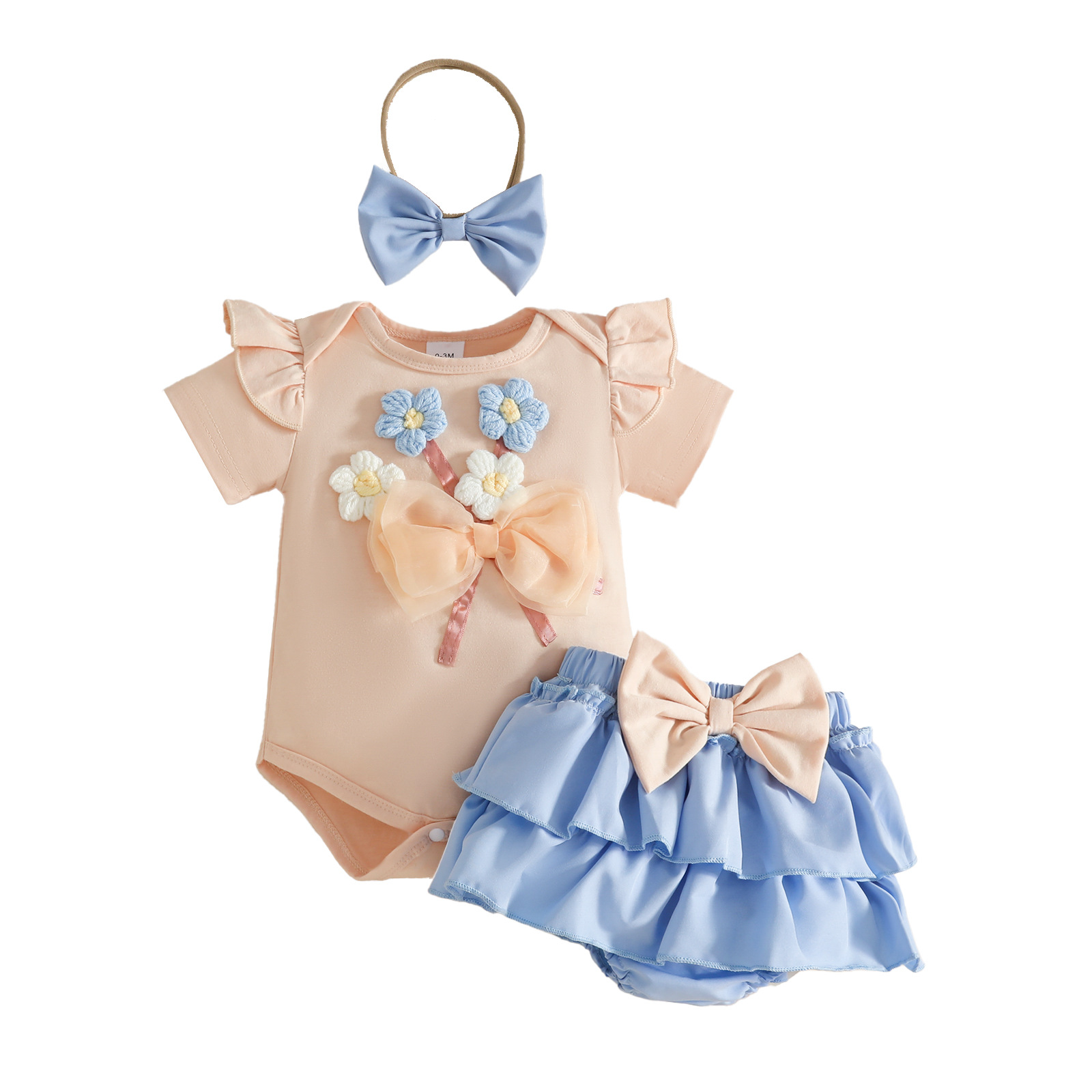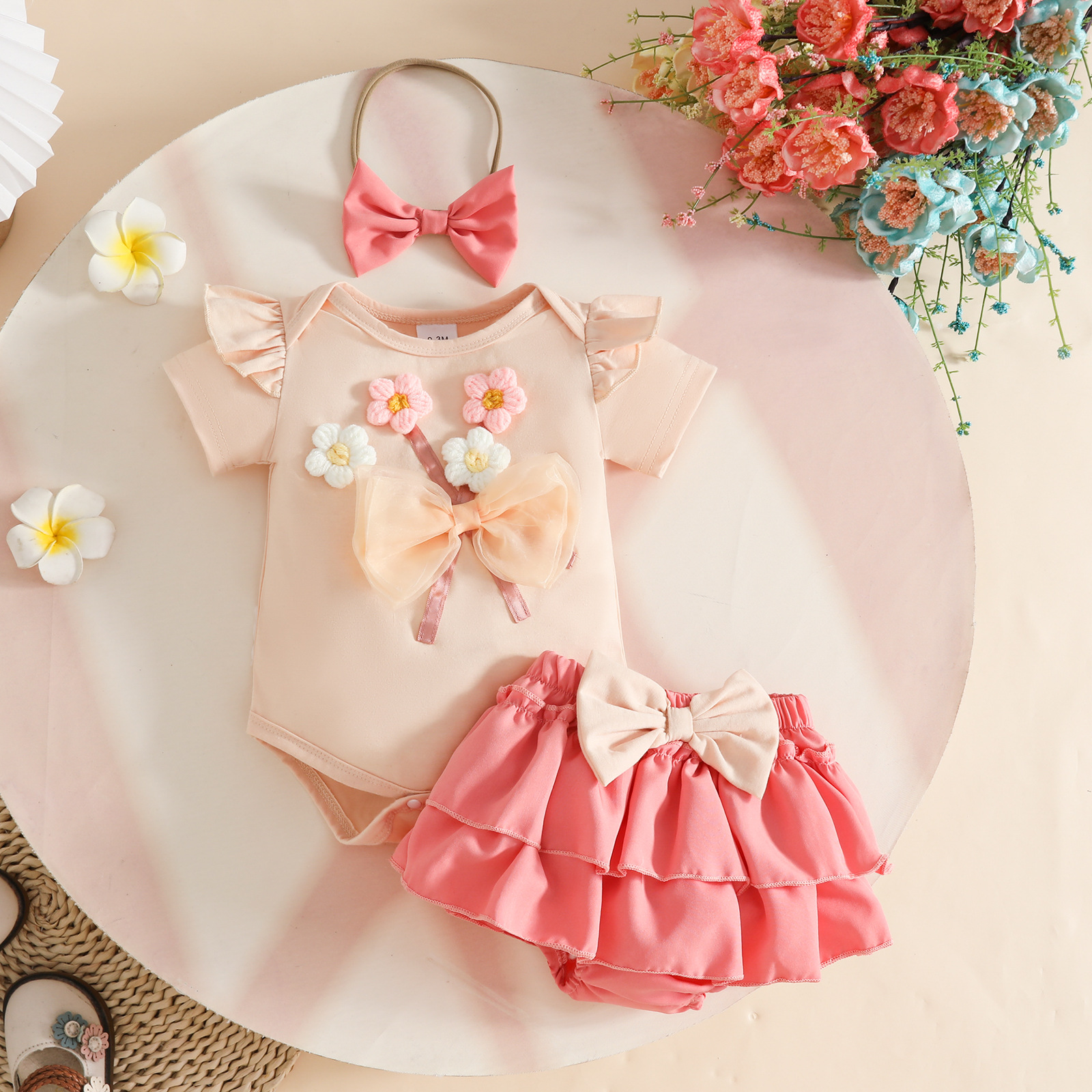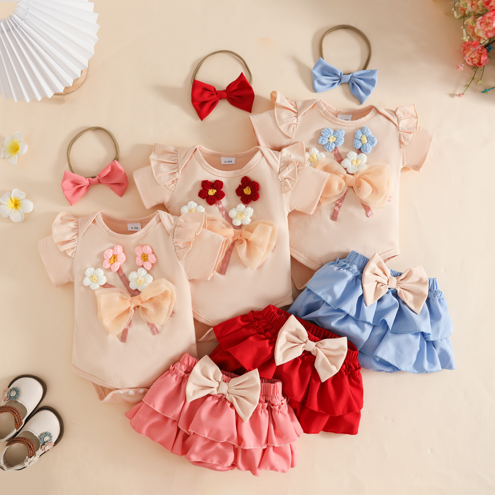 跨境2026夏款女婴花朵短袖三角哈衣+荷叶边三角短裤+发带三件套装