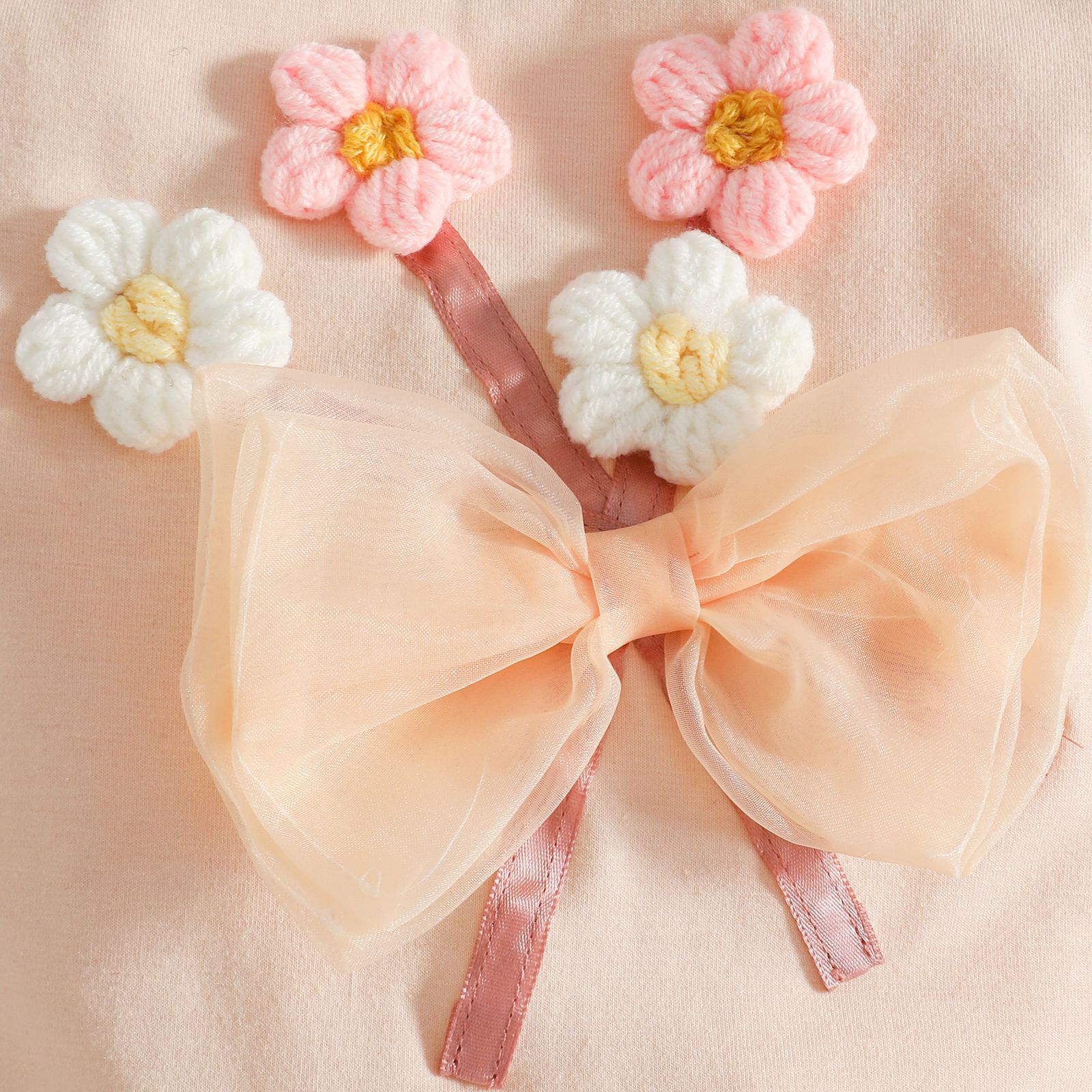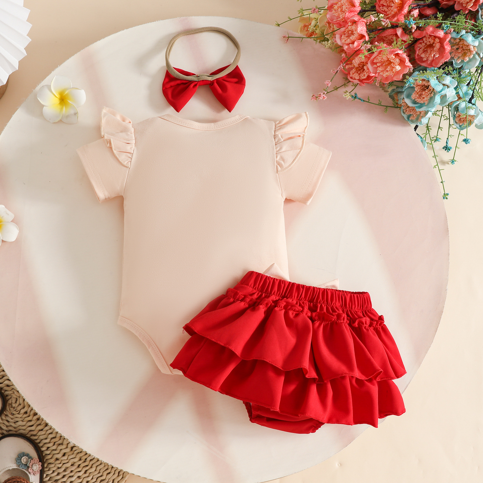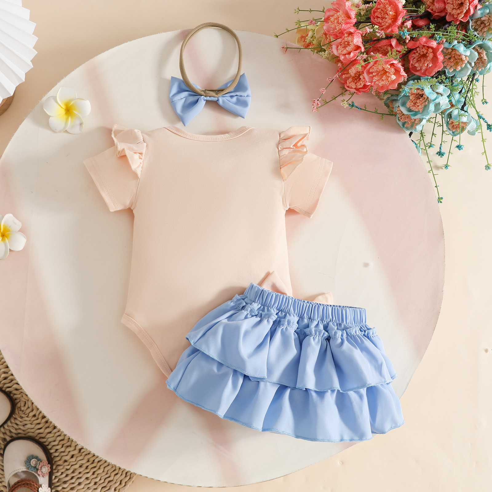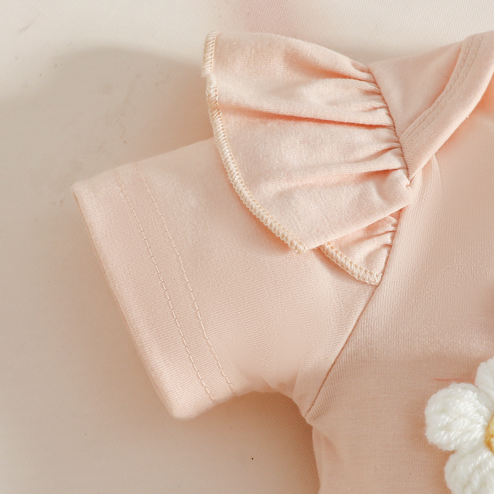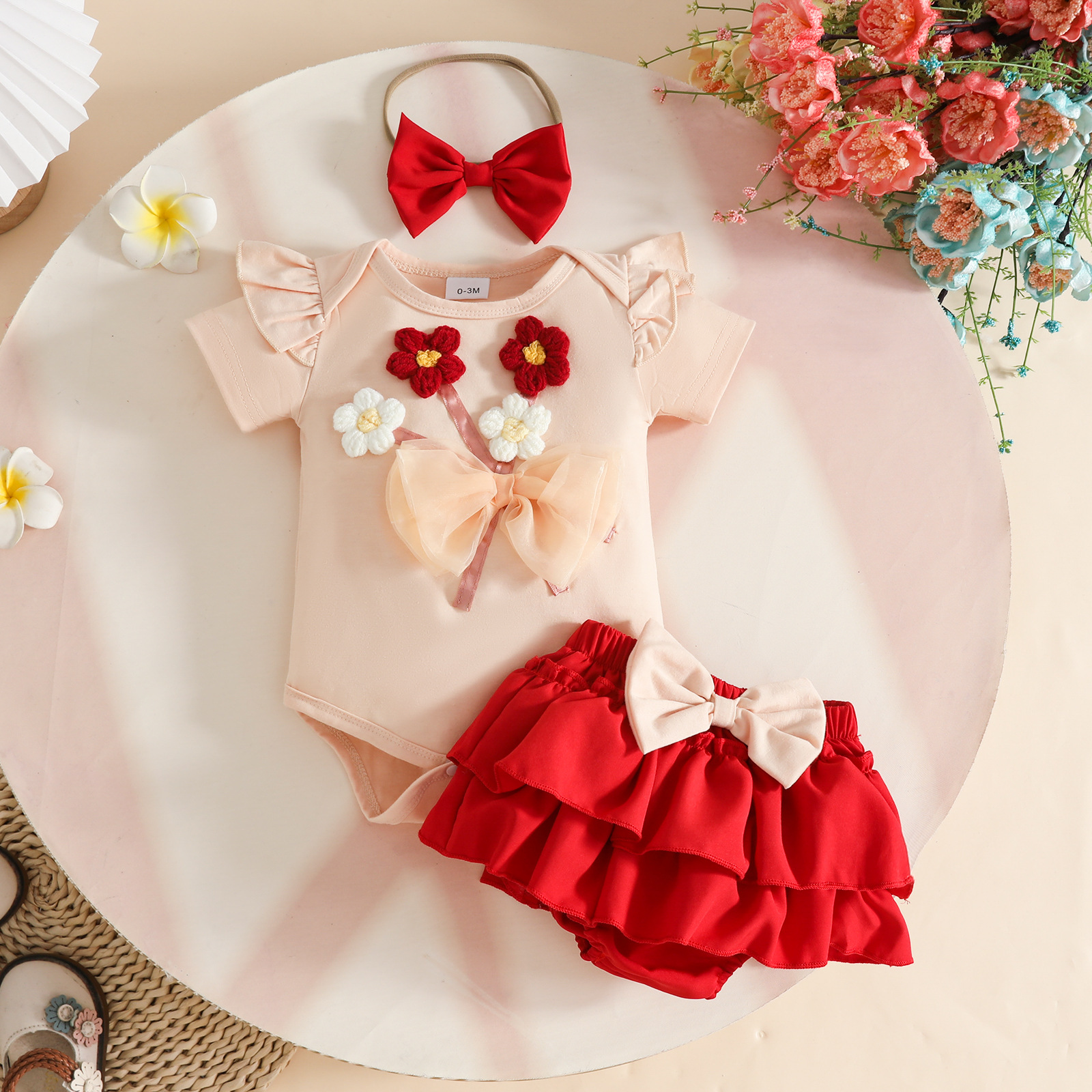 跨境2026夏款女婴花朵短袖三角哈衣+荷叶边三角短裤+发带三件套装