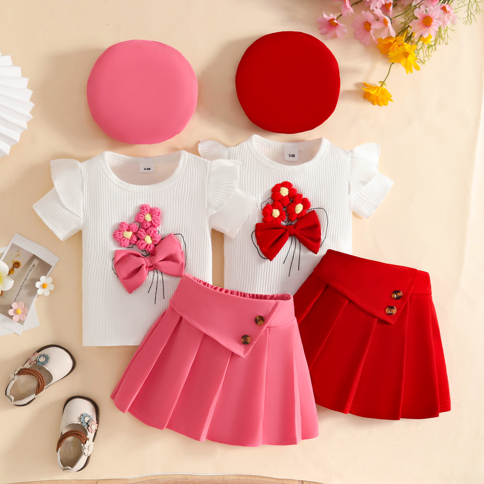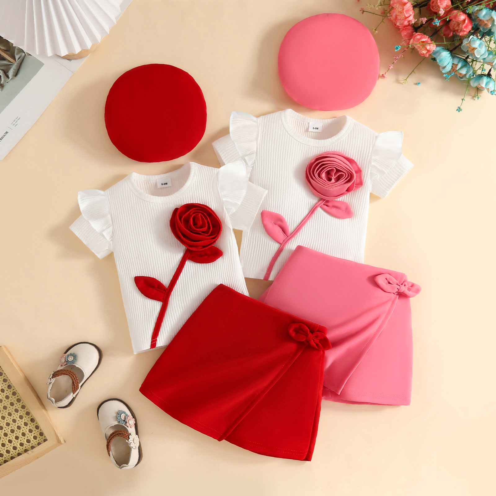 跨境婴儿立体玫瑰花坑条短袖上衣蝴蝶结纯色半身裙贝雷帽夏季套装