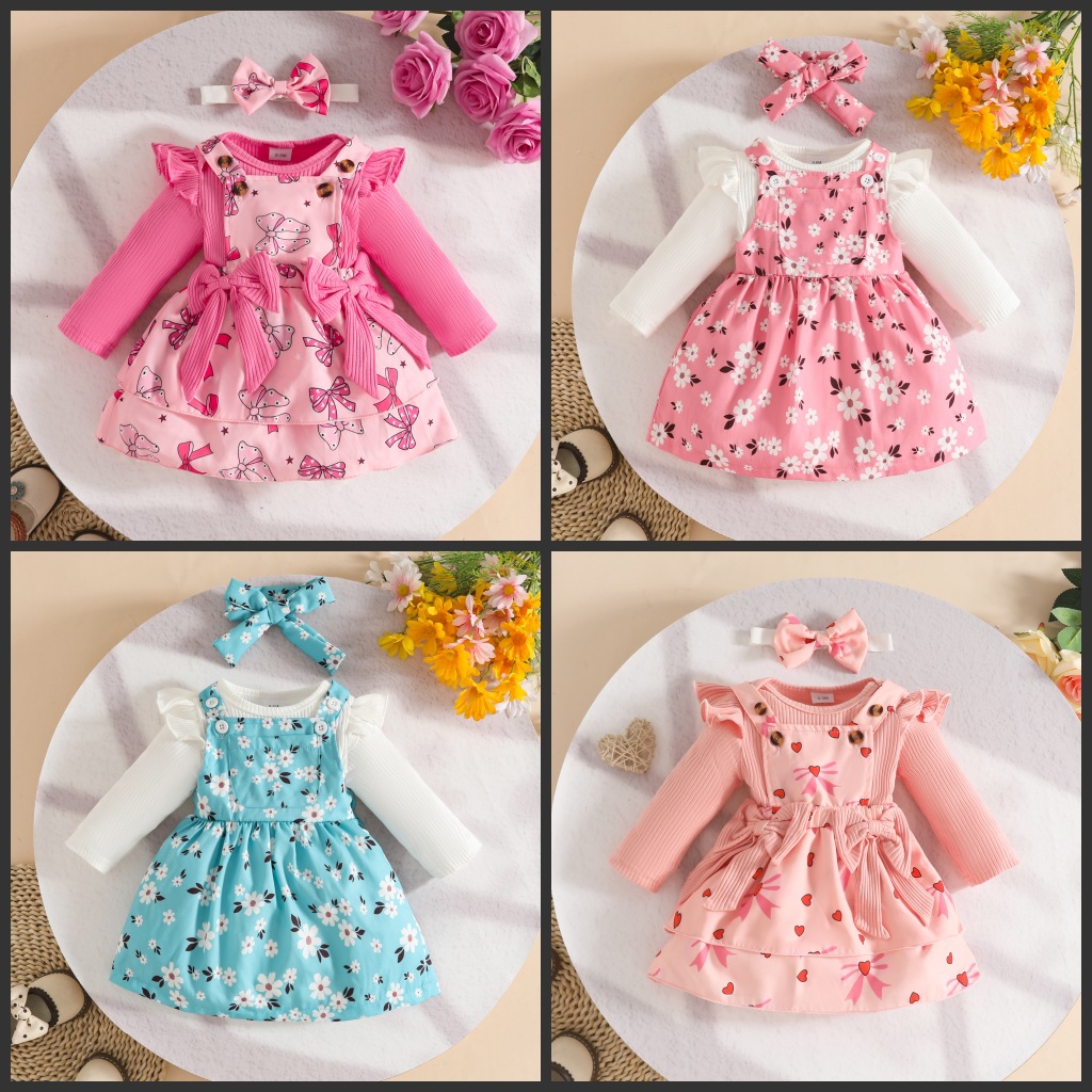 女の赤ちゃんドレスセット 2025 秋と冬子供服小さな新鮮な花プリントスカート無地長袖トップヘアバンド