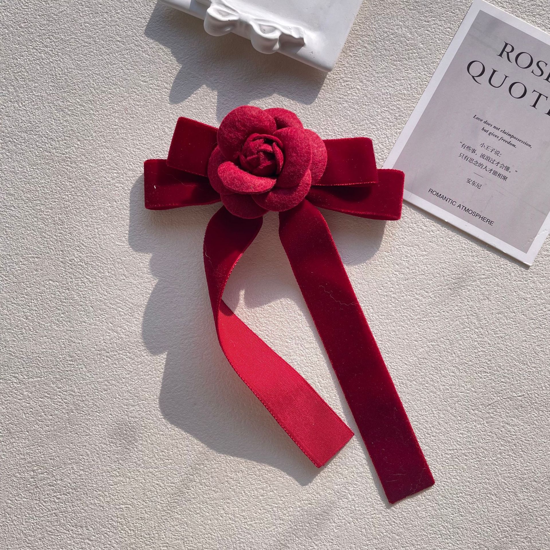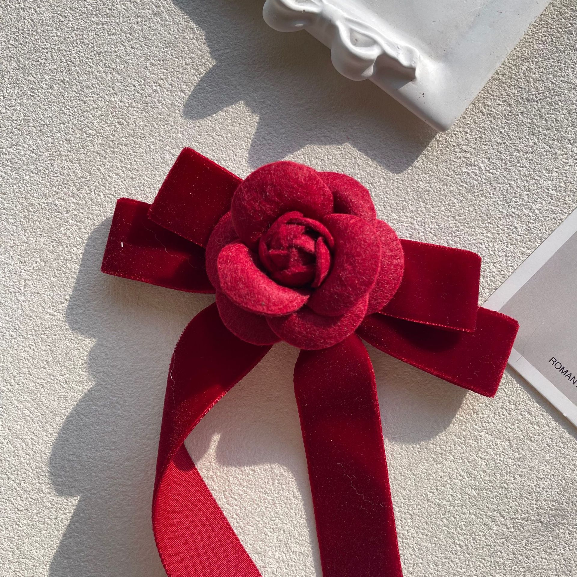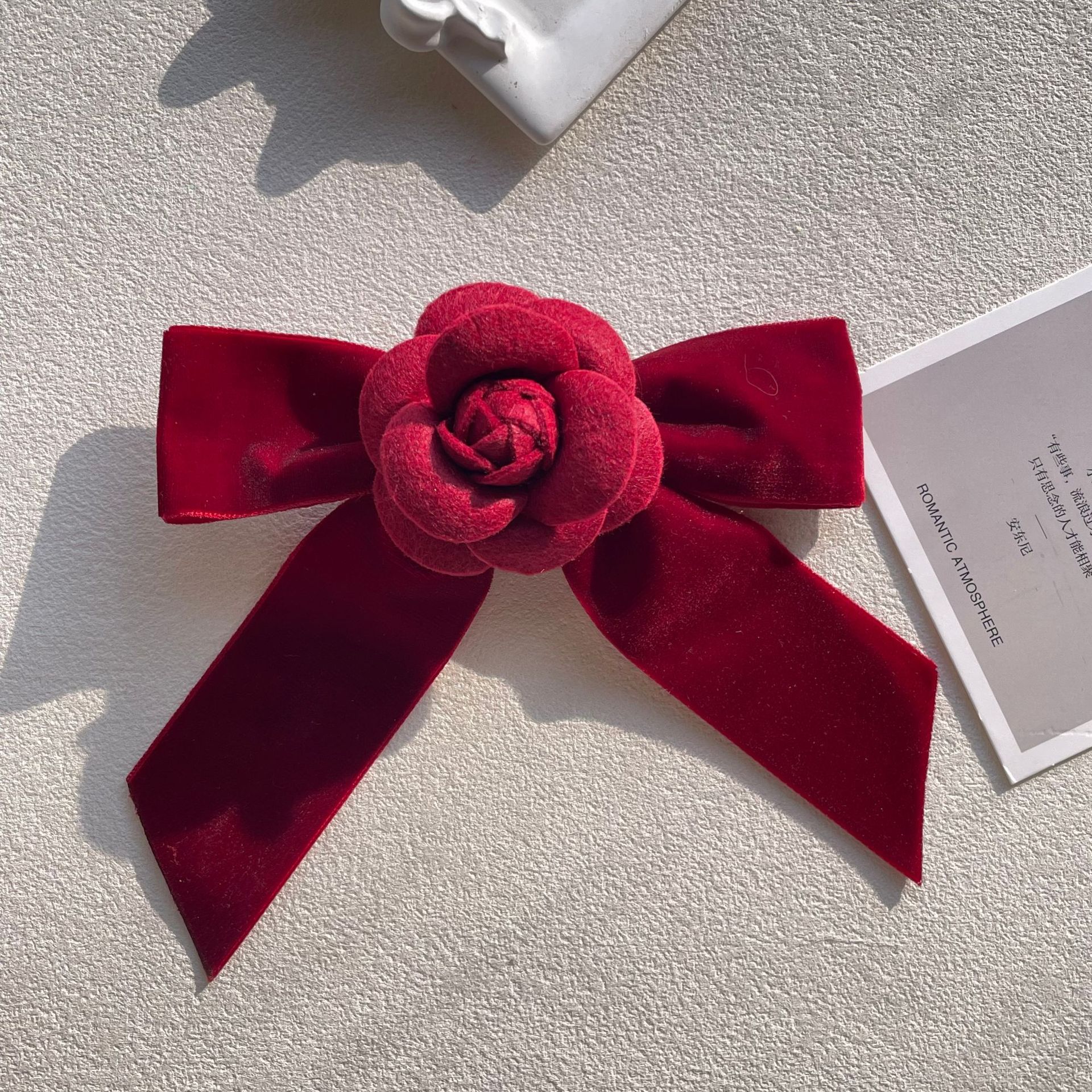 新款酒红天鹅绒小香风山茶花胸针蝴蝶结胸花别针百搭领结花女配饰