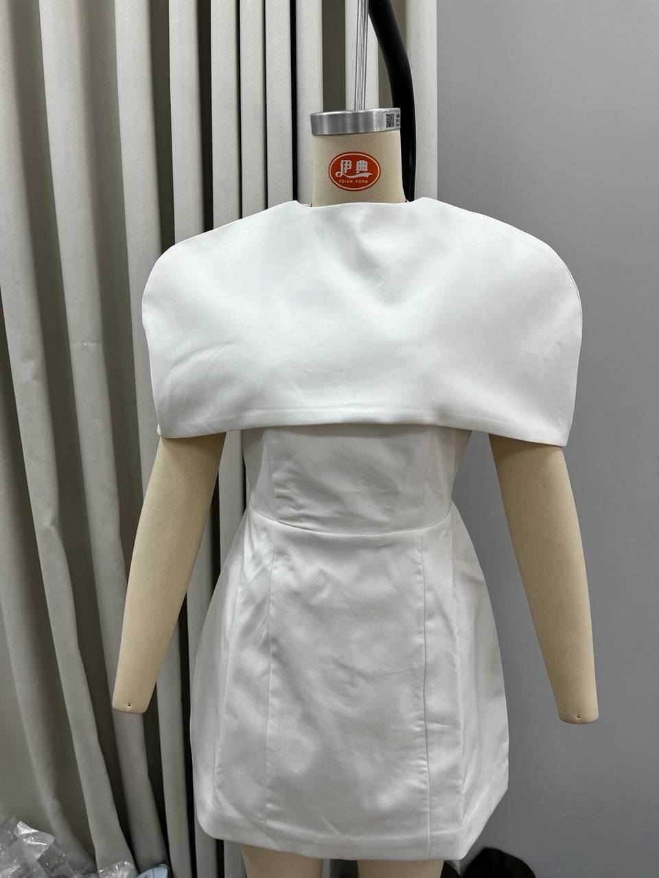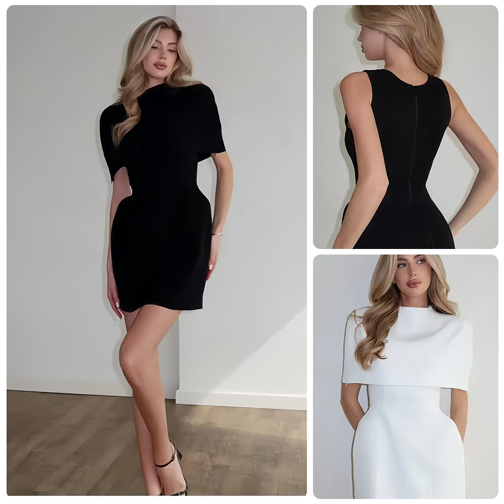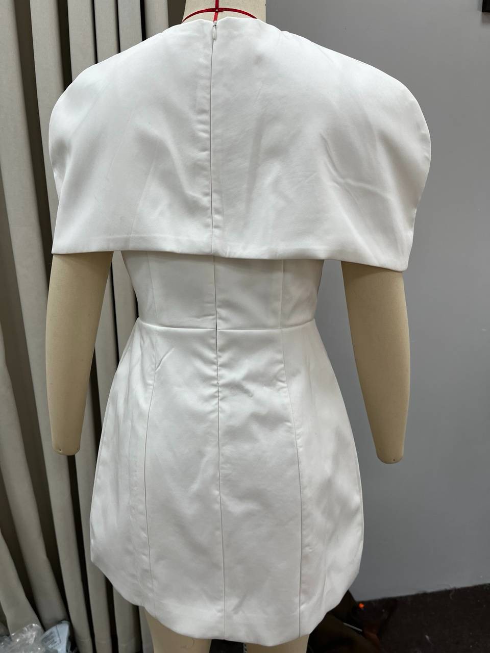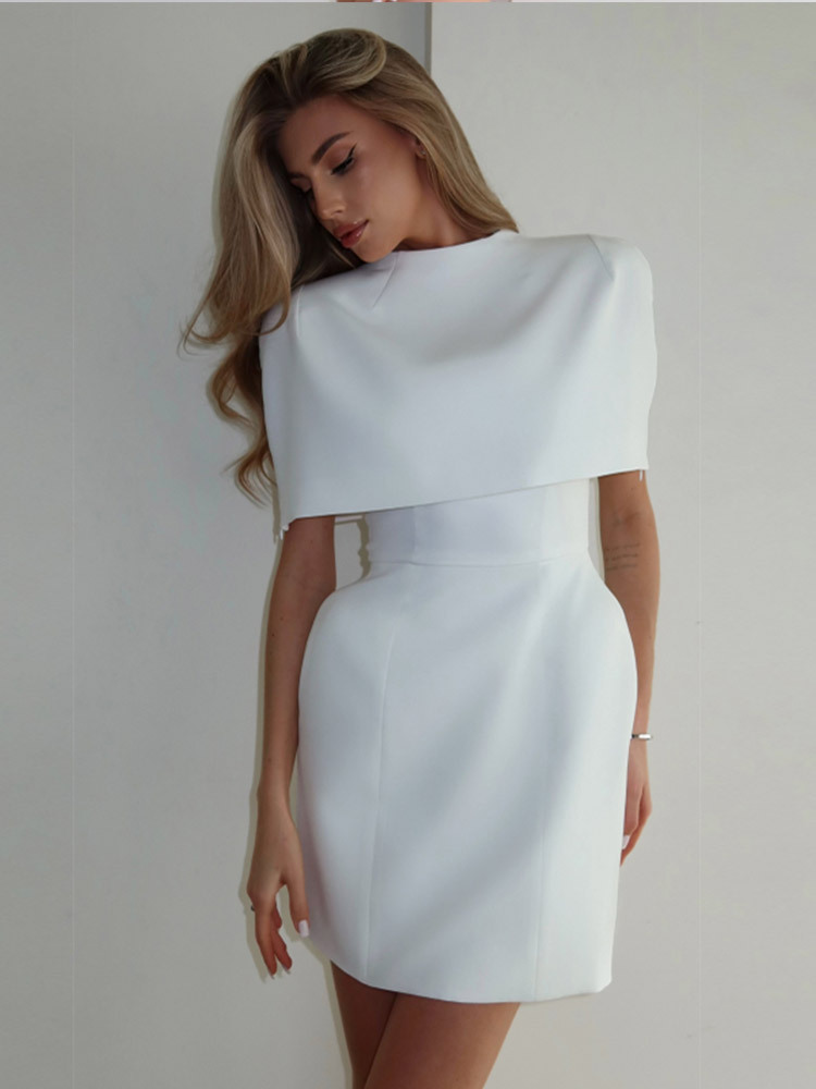 欧美2025新款白色披肩连衣裙 立领短袖修身短裙 名媛气质礼服裙女