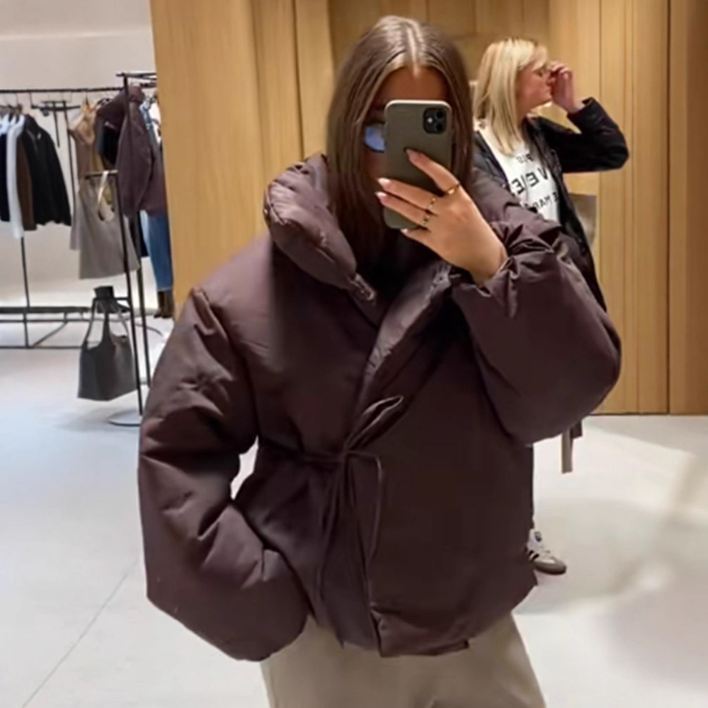 时尚休闲设计感立领系带薄棉服短款外套2025秋冬新款跨境欧美风