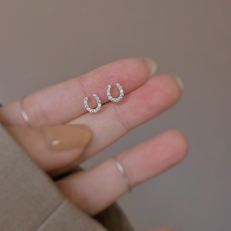 S999纯银幸运马蹄耳钉女微镶锆石轻奢高级感迷你养耳洞耳饰送女友