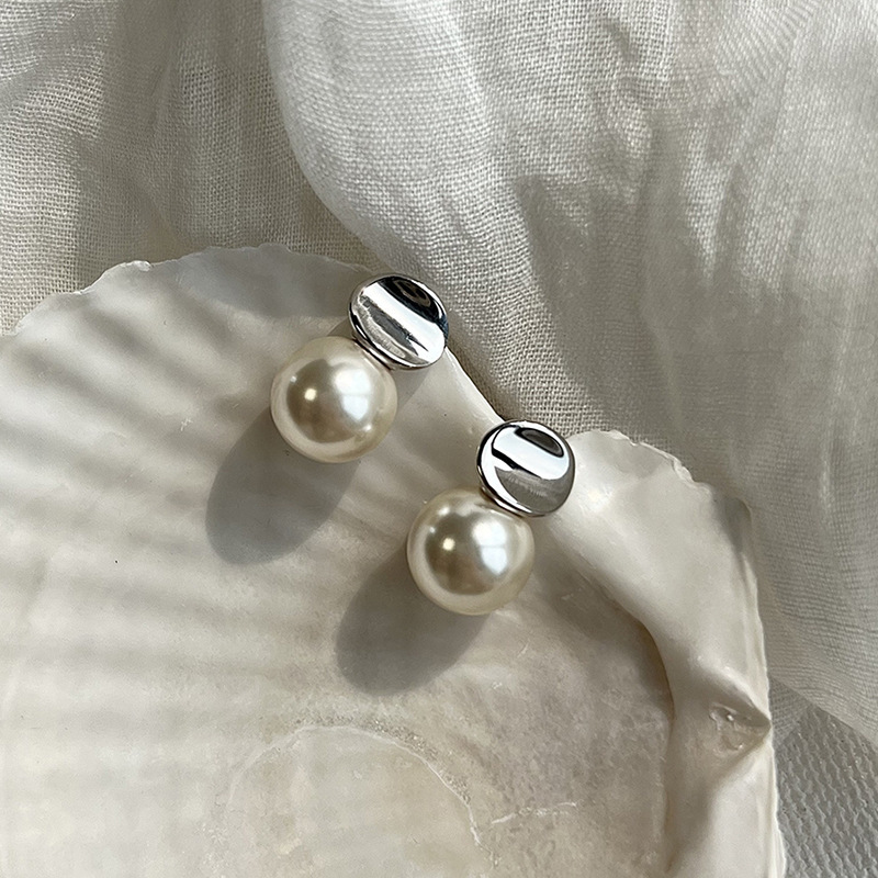 S999纯银韩风几何曲面耳钉女款时尚轻奢高级感仿珍珠耳环气质耳饰