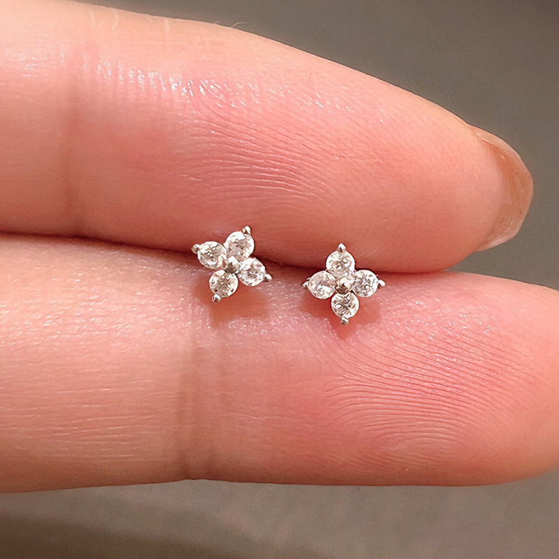 S999纯银迷你四叶草耳钉女精致简约小清新休闲风花朵耳饰睡觉免摘