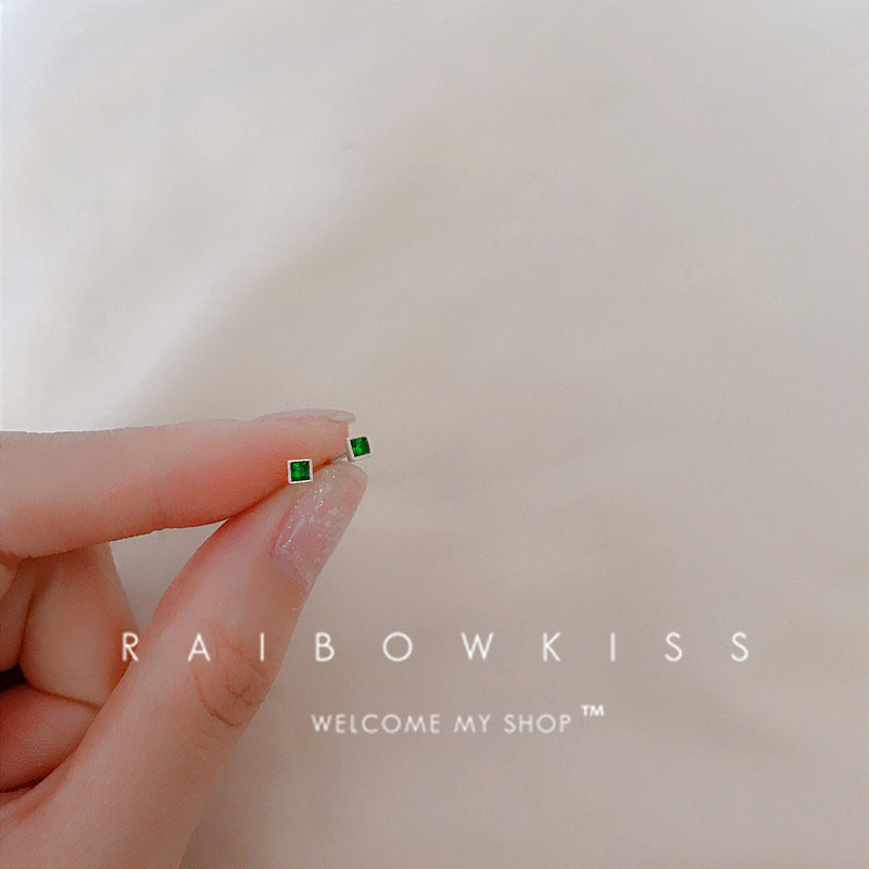 S999纯银祖母绿锆石耳钉女迷你小众高级感方形耳环养耳洞百搭耳饰