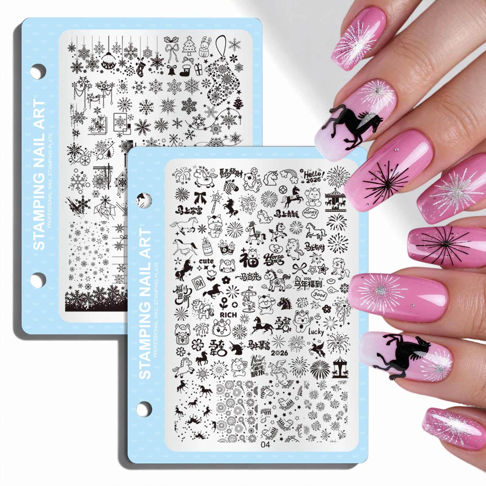 爆款马年新年美甲印花钢板格纹雪花豹纹蕾丝蝴蝶结指甲转印模板