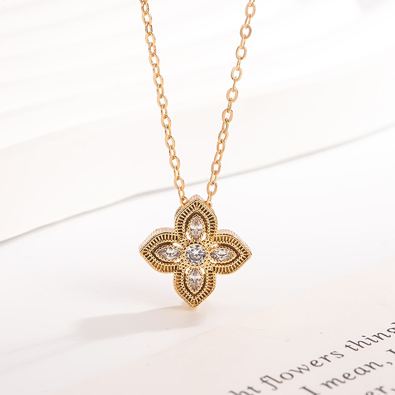 新款浮雕四叶草项链百搭轻奢镂空闪钻女时尚高级感设计饰品女