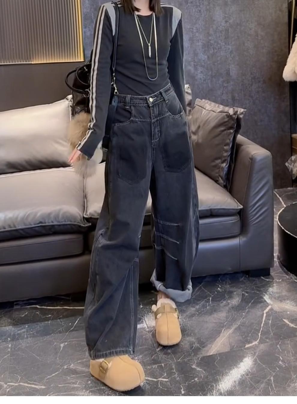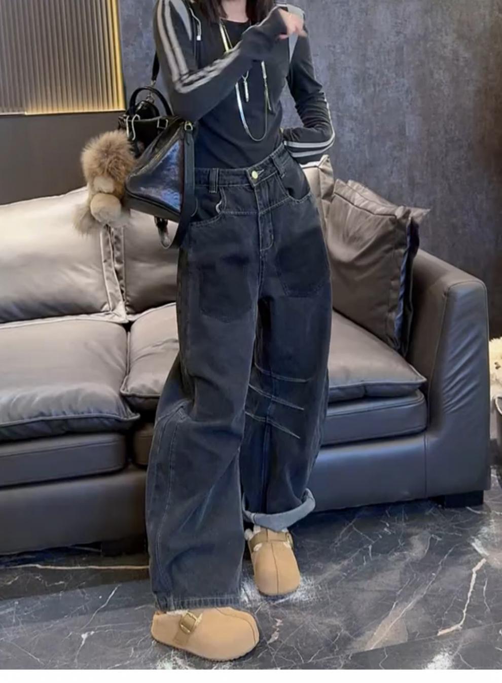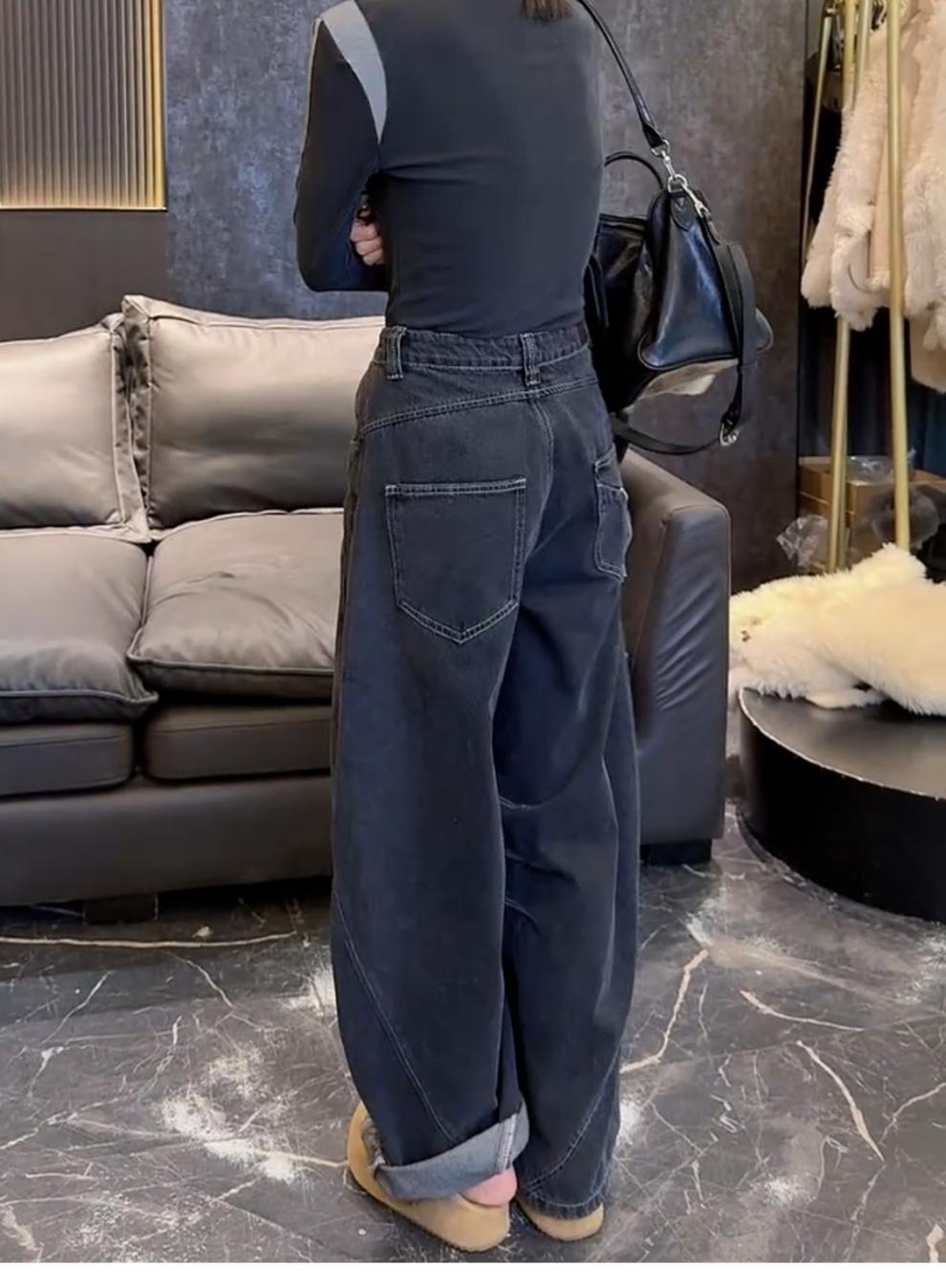 ストレートジーンズの女性2024年の新型春秋モデルはやせているズボンのセメントの灰色の狭い版のワイドパンツを現します。