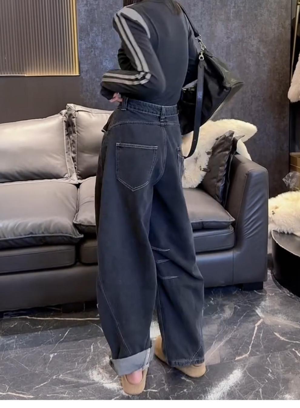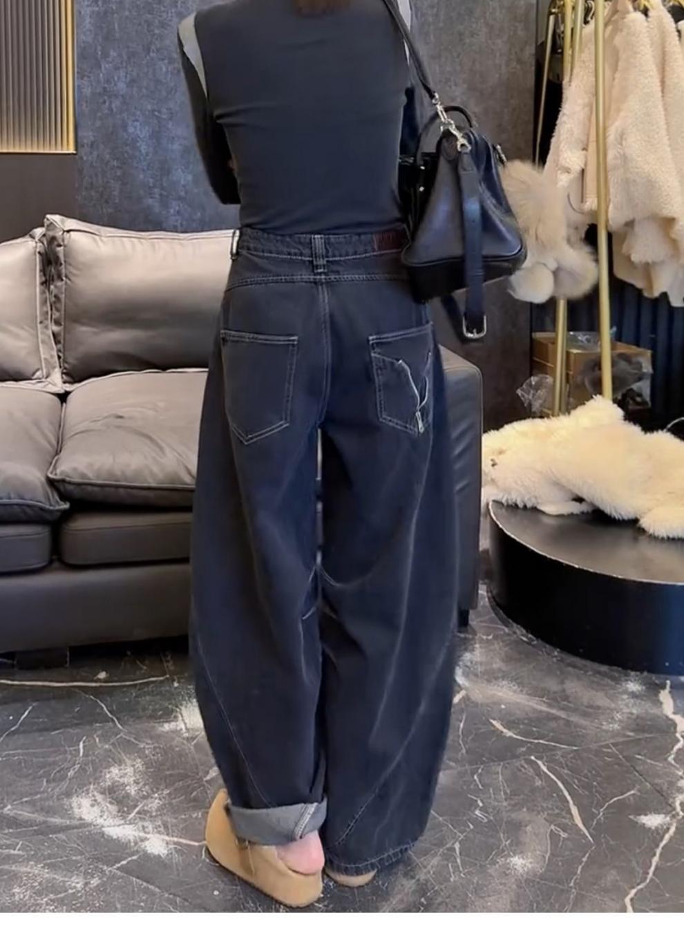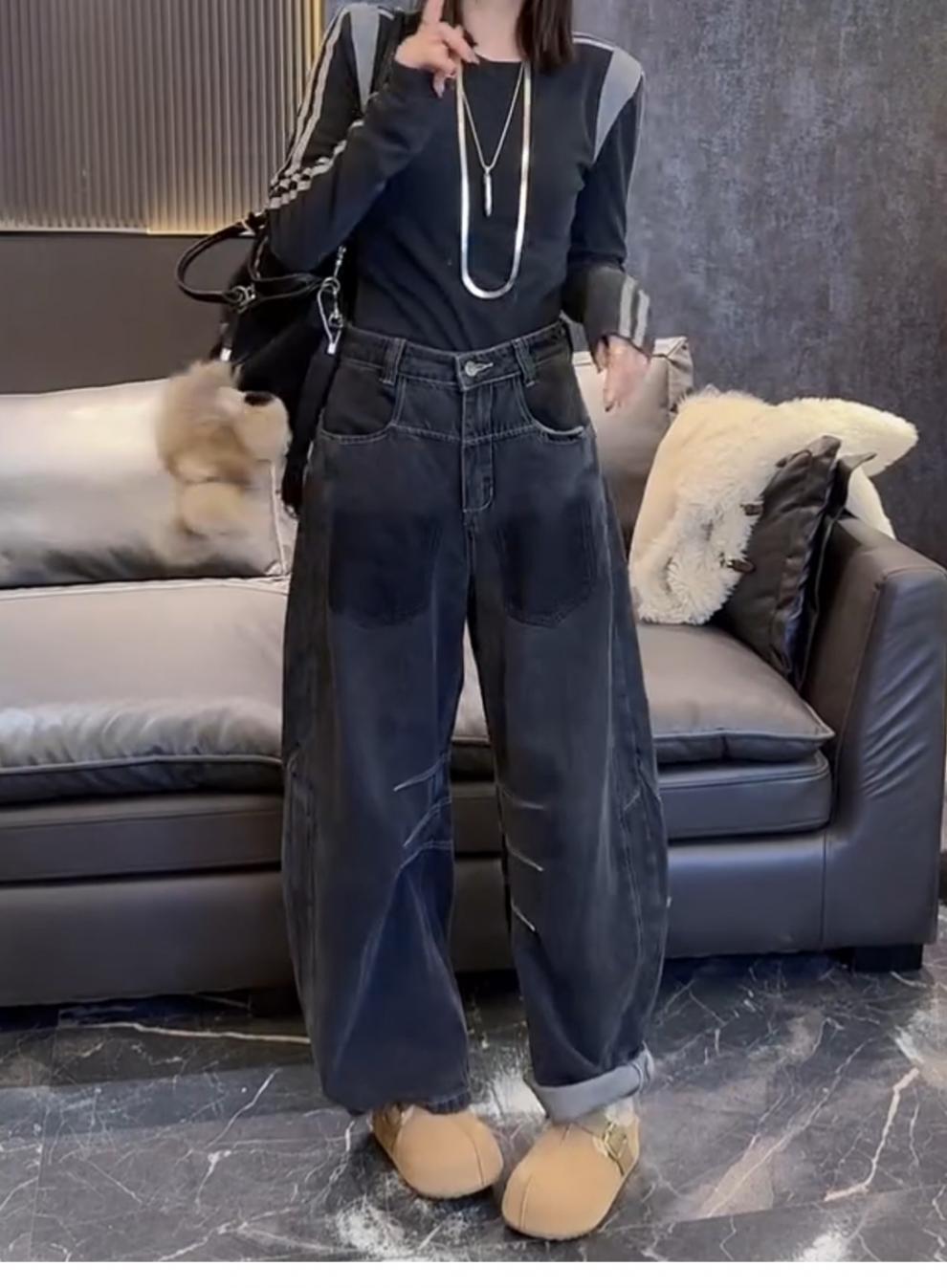 ストレートジーンズの女性2024年の新型春秋モデルはやせているズボンのセメントの灰色の狭い版のワイドパンツを現します。