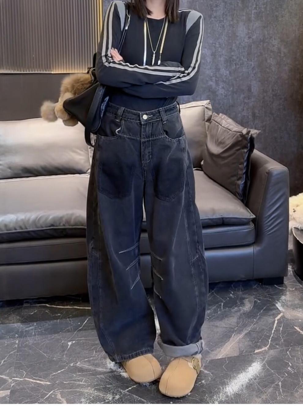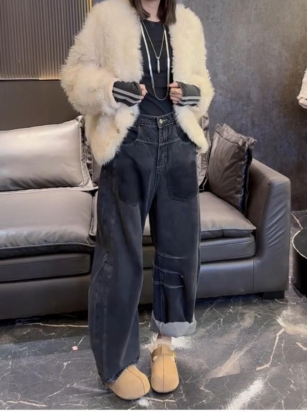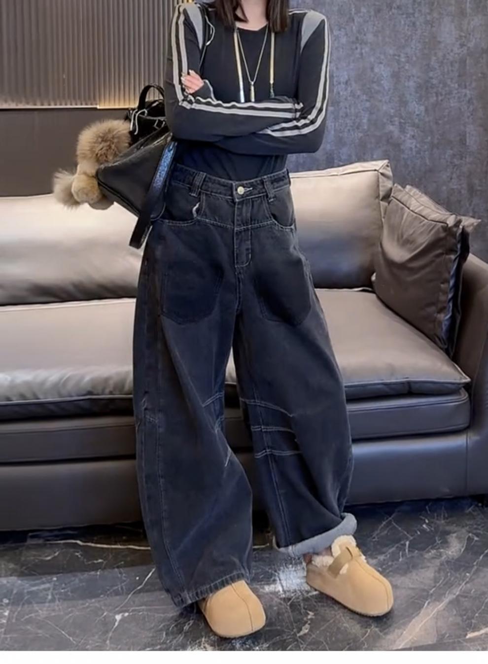 大码加绒加厚牛仔裤女秋冬季新款复古阔腿裤胖mm显瘦宽松直筒裤子