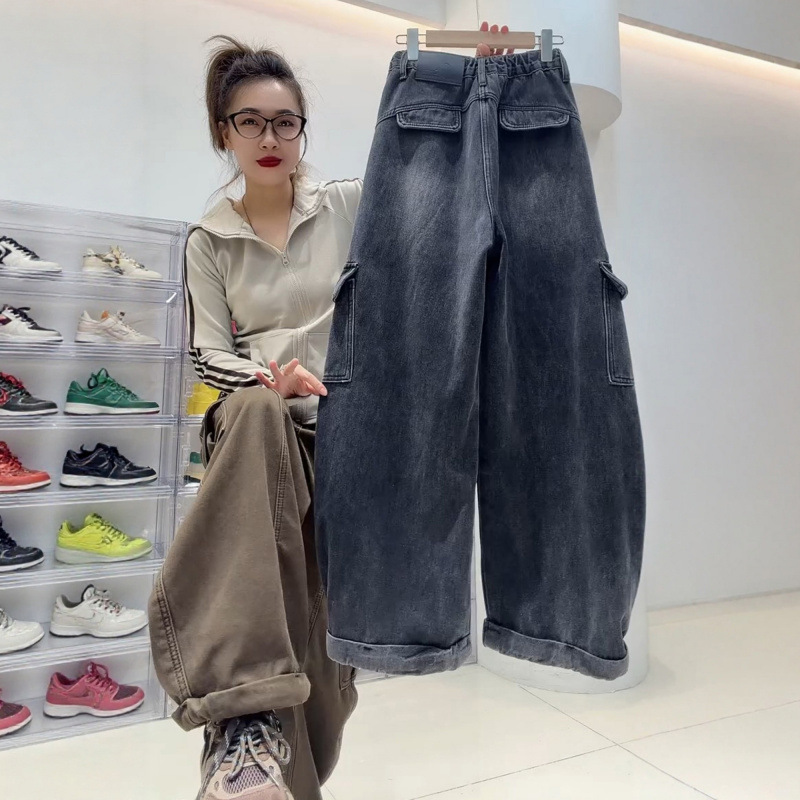 2025年秋冬新款高腰显瘦阔腿弯刀裤女大码胖mm加绒加厚工装牛仔裤