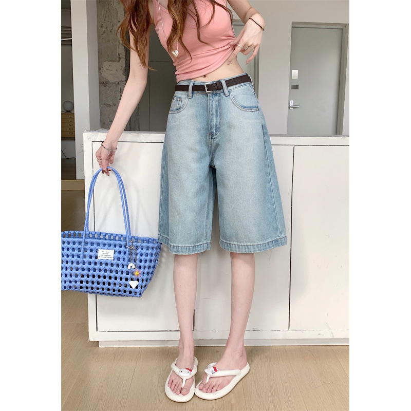 女性用5点ジーンズ春夏新作小柄ゆったりストレート薄手ハイウエストスリムワイドレッグAラインミドルパンツ