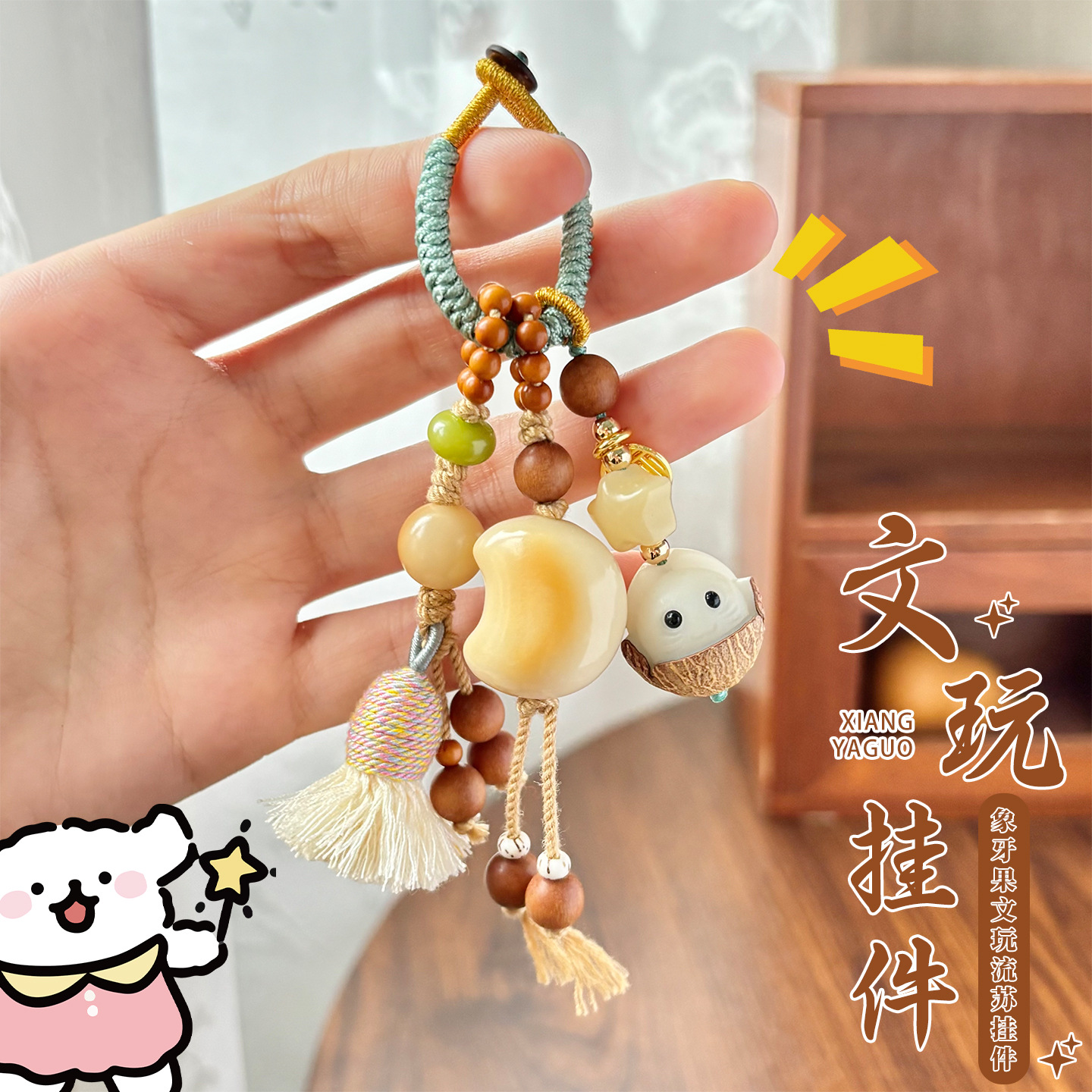 天然象牙果炭烧月亮搭配菩提根包挂文玩流苏款钥匙扣挂件提溜坠