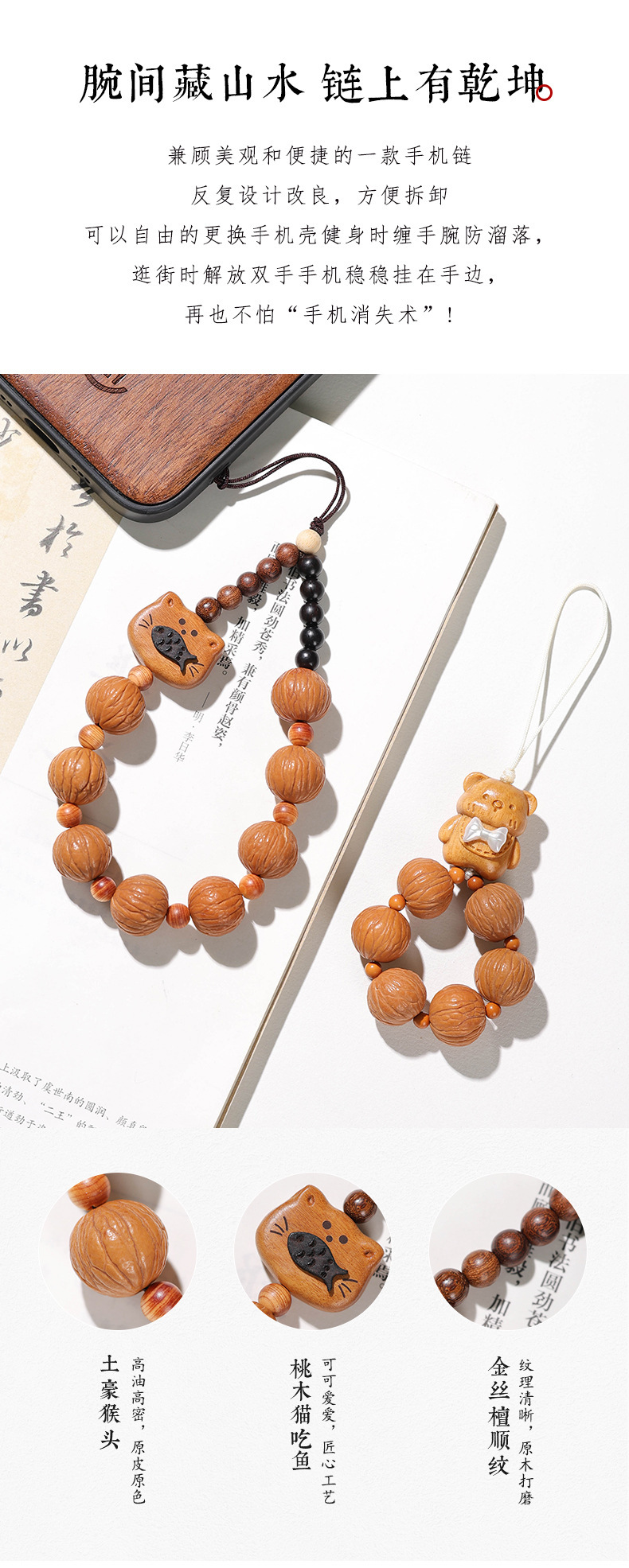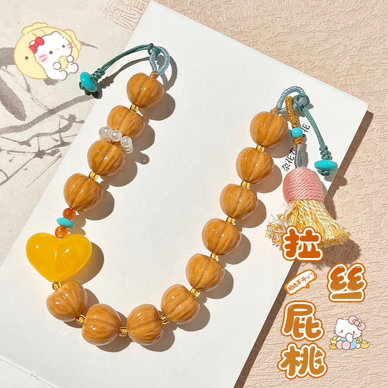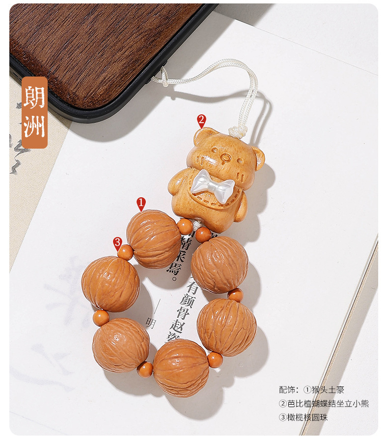 崖柏圆珠手机链男女文玩小熊配饰拉丝屁桃挂绳饰品防丢钥匙扣短款