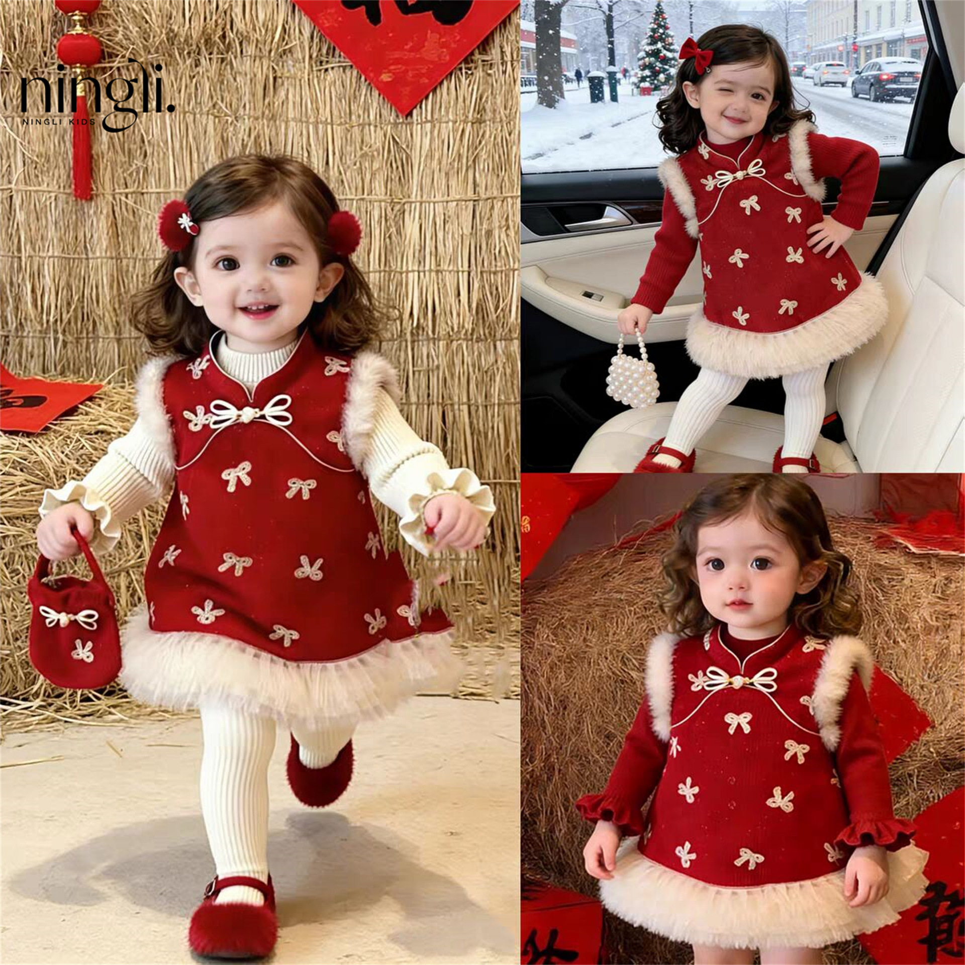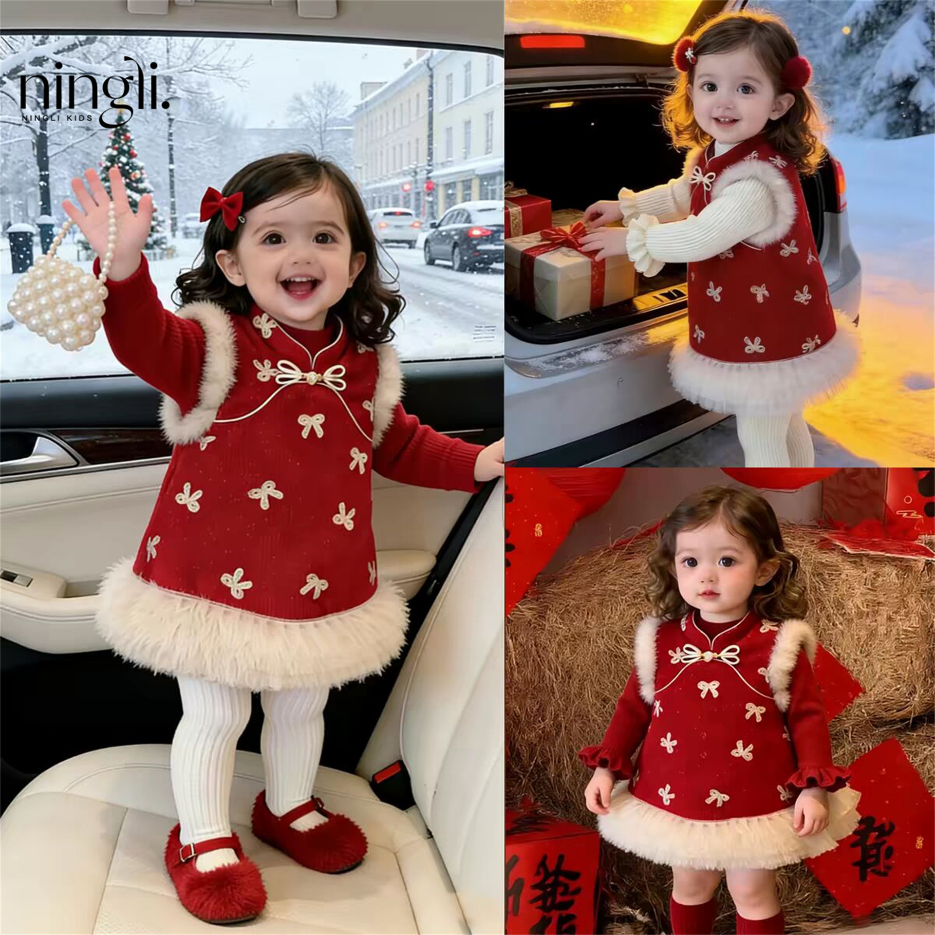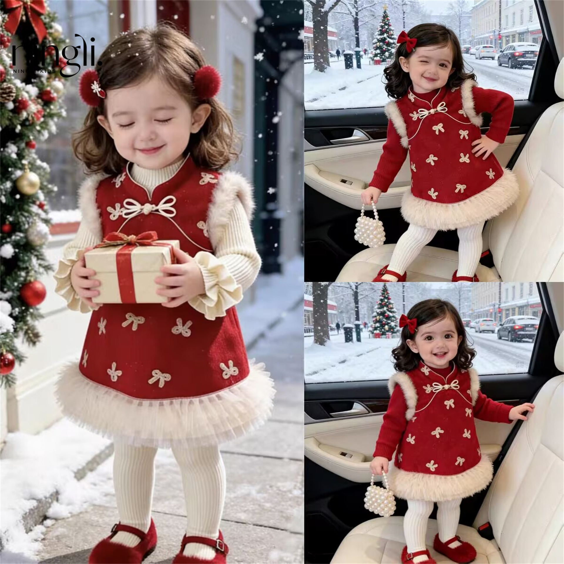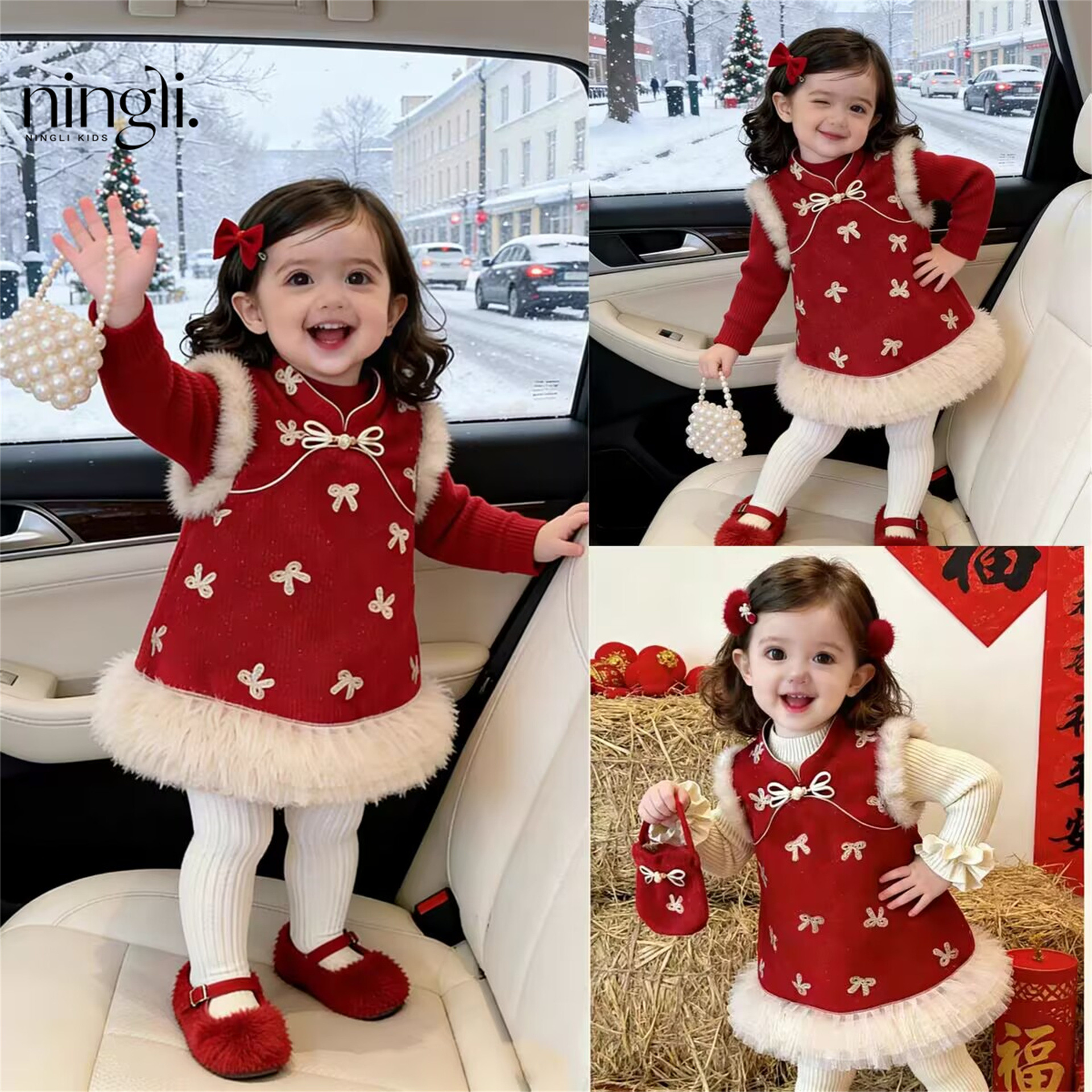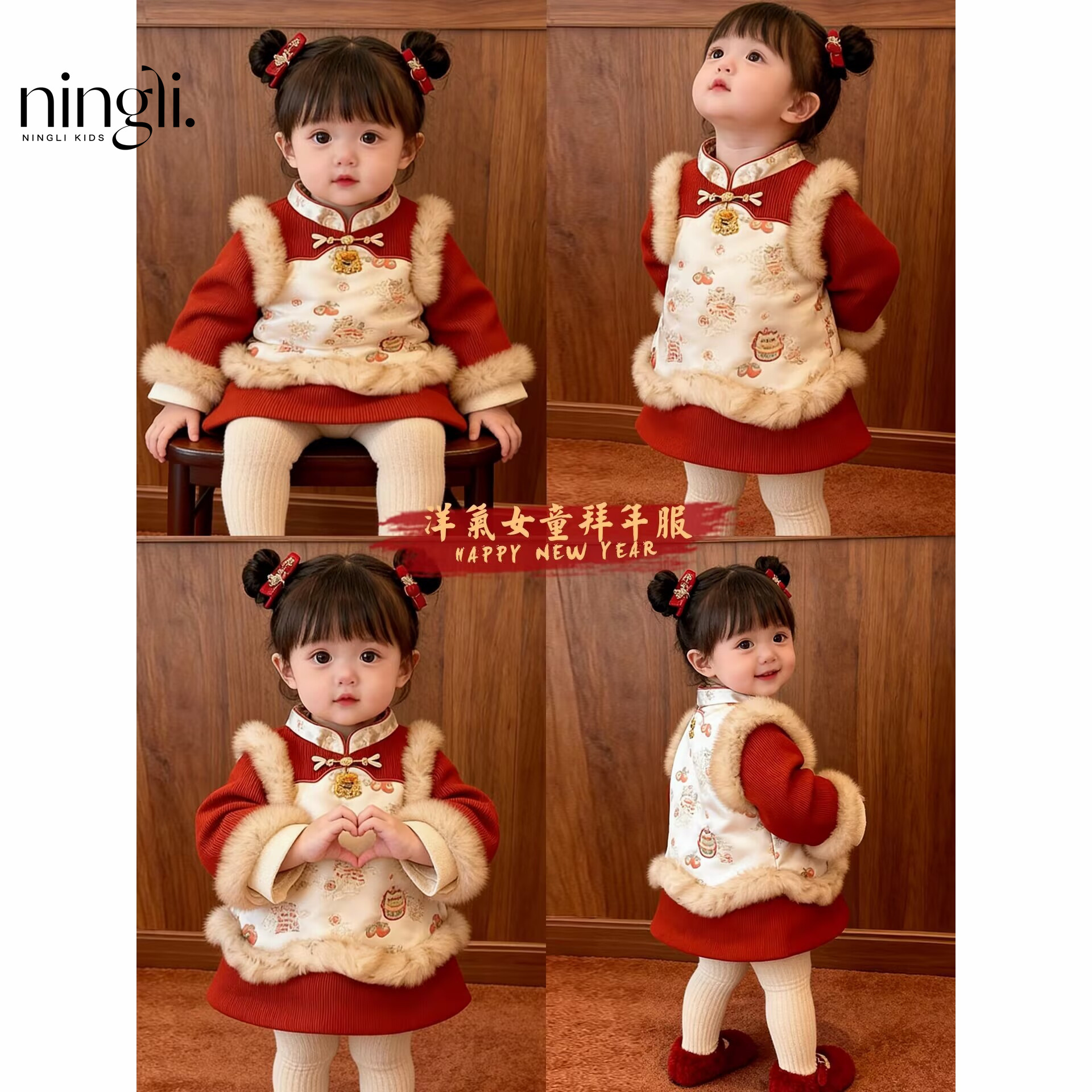 柠里新中式女童红色旗袍裙拜年服加绒背心公主裙女宝生日周岁礼服