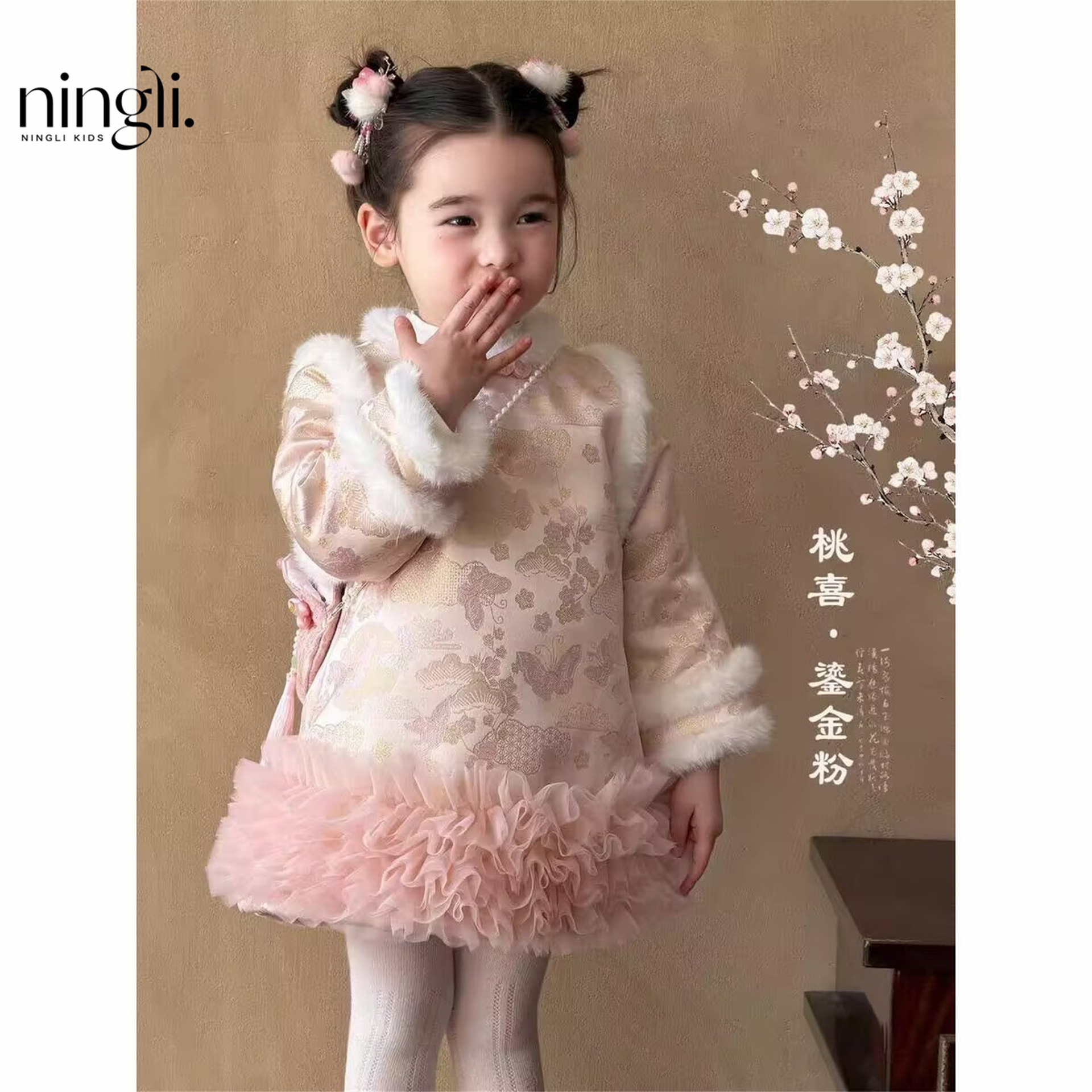 柠里女宝夹棉唐装汉服旗袍连衣裙秋冬季新款儿童拜年国风公主裙子