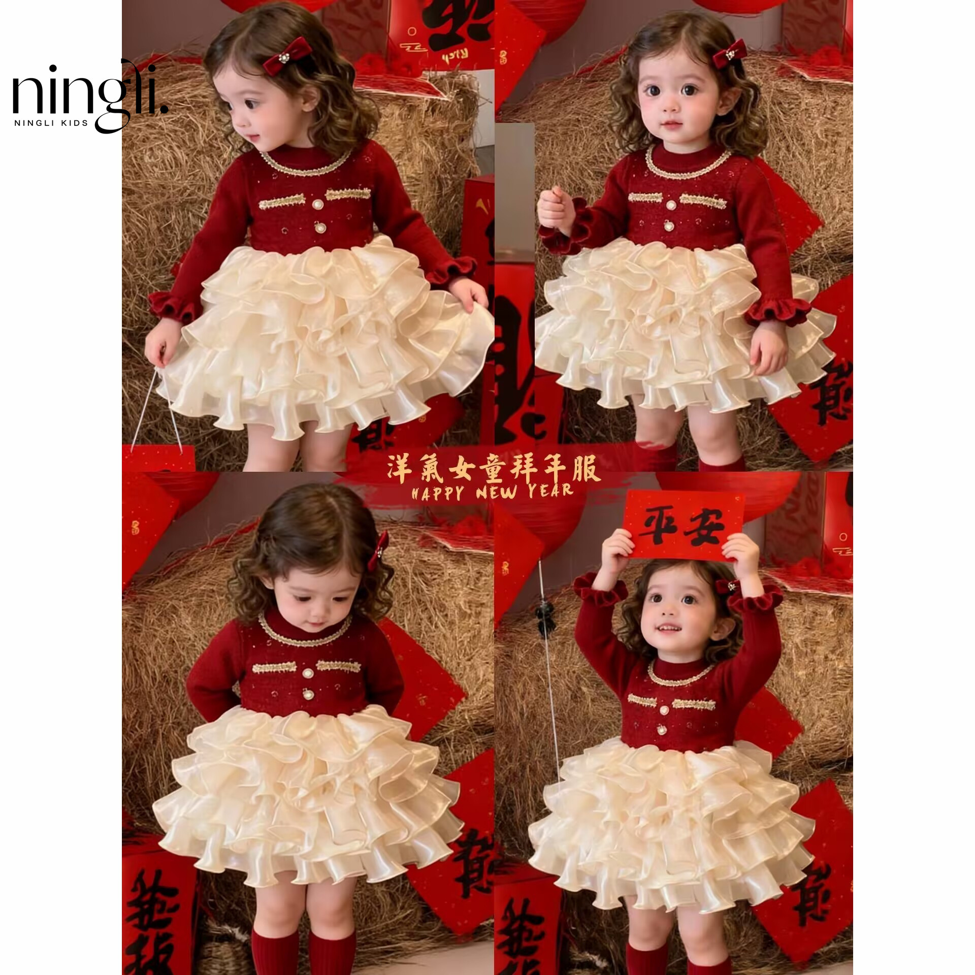 柠里女童拜年服冬款红色喜庆旗袍裙新中式女宝周岁生日礼服连衣裙