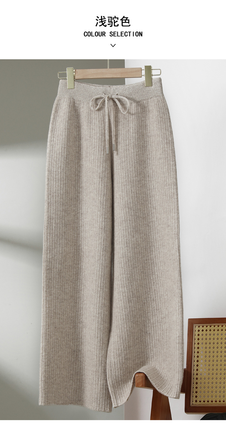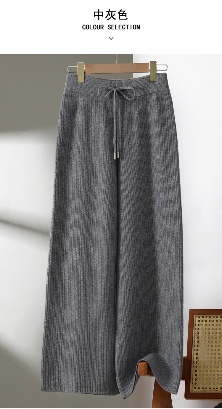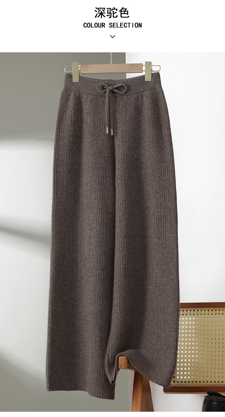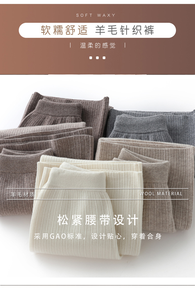 2025年秋冬新款纯羊毛针织休闲裤女纯色高腰宽松保暖卷边阔腿长裤