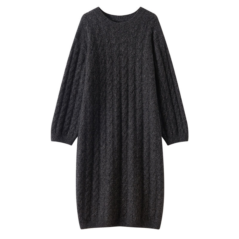 2025年秋新款蚕丝羊绒混纺圆领针织连衣裙长袖女款高腰扭花长裙