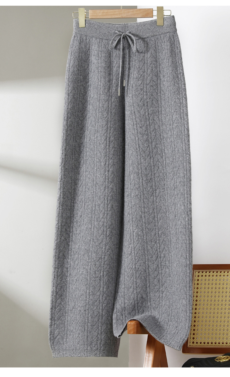 2025年秋冬新款纯羊毛双股加厚针织休闲裤女纯色扭花高腰阔腿长裤