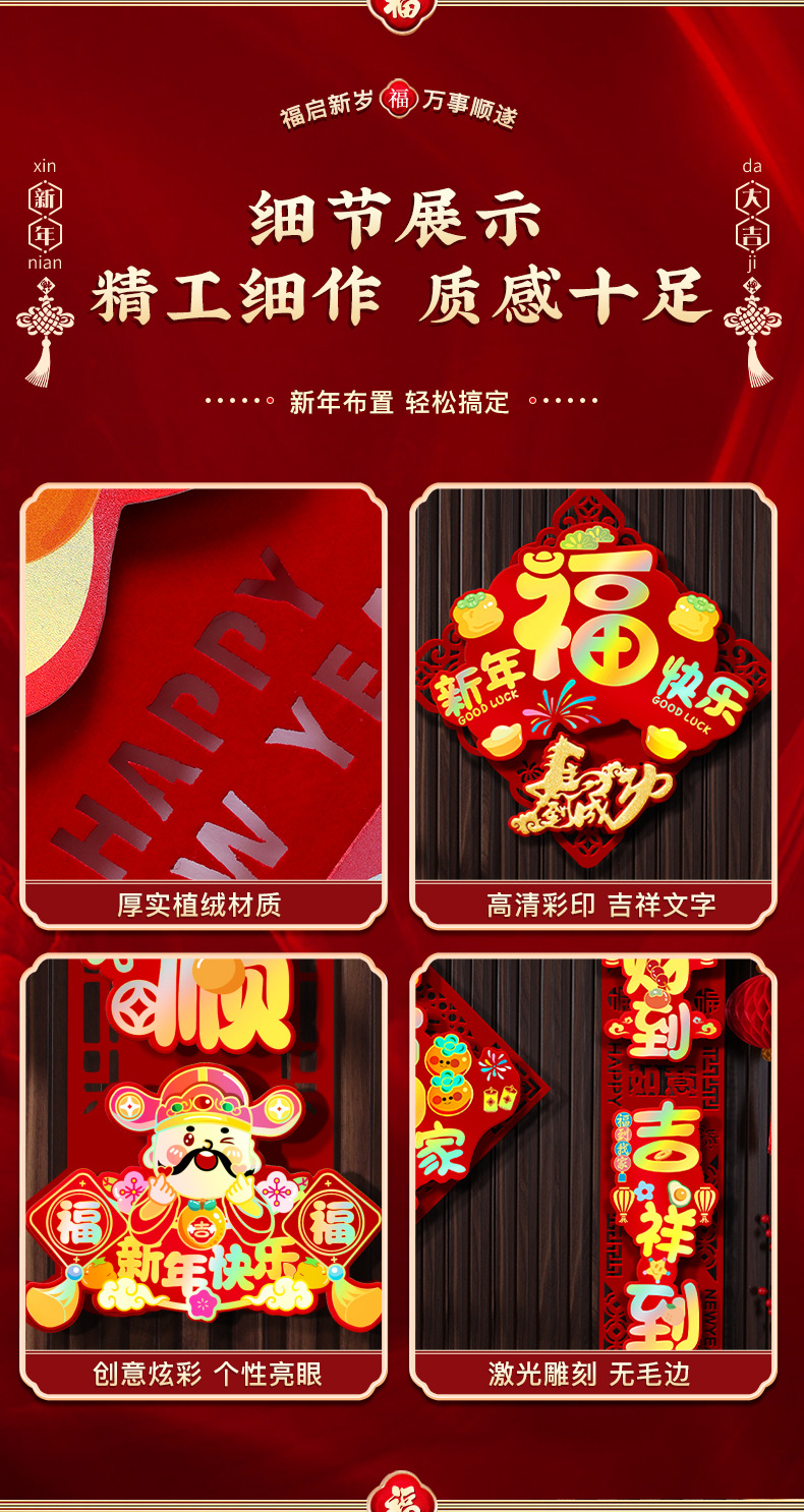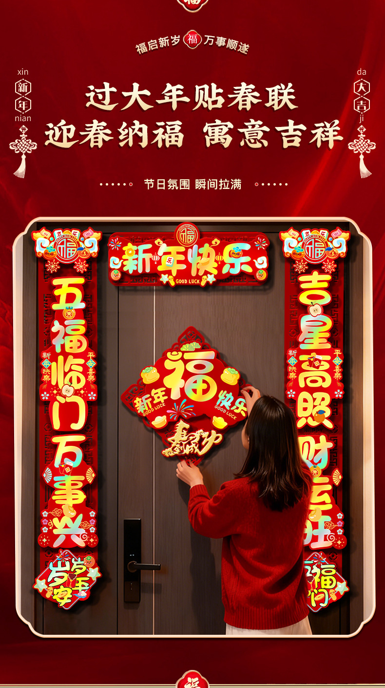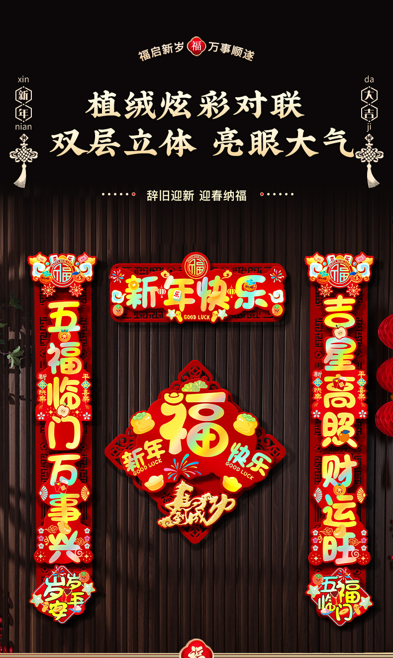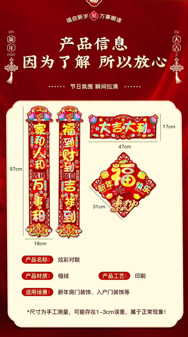 颜色 【马年大吉】PVC炫彩立体┊植绒对联,【马年大吉】对联+【福气满满】福字贴,【马年大吉】对联+【新年快乐】福字贴,【马年大吉】对联+【红红火火】福字贴,【新年快乐】PVC炫彩立体┊植绒对联,【新年快乐】对联+【柿柿如意】福字贴,【新年快乐】对联+【新年快乐】福字贴,【新年快乐】对联+【红红火火】福字贴,【平安喜乐】PVC炫彩立体┊植绒对联,【平安喜乐】对联+【柿柿如意】福字贴,【平安喜乐】对联+【福气满满】福字贴,【平安喜乐】对联+【新年快乐】福字贴,【五福临门】PVC炫彩立体┊植绒对联,【五福临门】对联+【福到我家】福字贴,【五福临门】对联+【新年快乐】福字贴,【大吉大利】PVC炫彩立体┊植绒对联,【大吉大利】对联+【福到我家】福字贴,【大吉大利】对联+【新年快乐】福字贴,【新年快乐-福】PVC炫彩立体┊植绒对联,【新年快乐-福】对联+【福到我家】福字贴,【新年快乐-福】对联+【新年快乐】福字贴,【五福临门-财神】PVC炫彩立体┊植绒对联,【五福临门-财神】对联+【福到我家】福字贴,【五福临门-财神】对联+【新年快乐】福字贴
