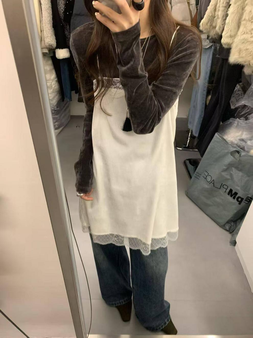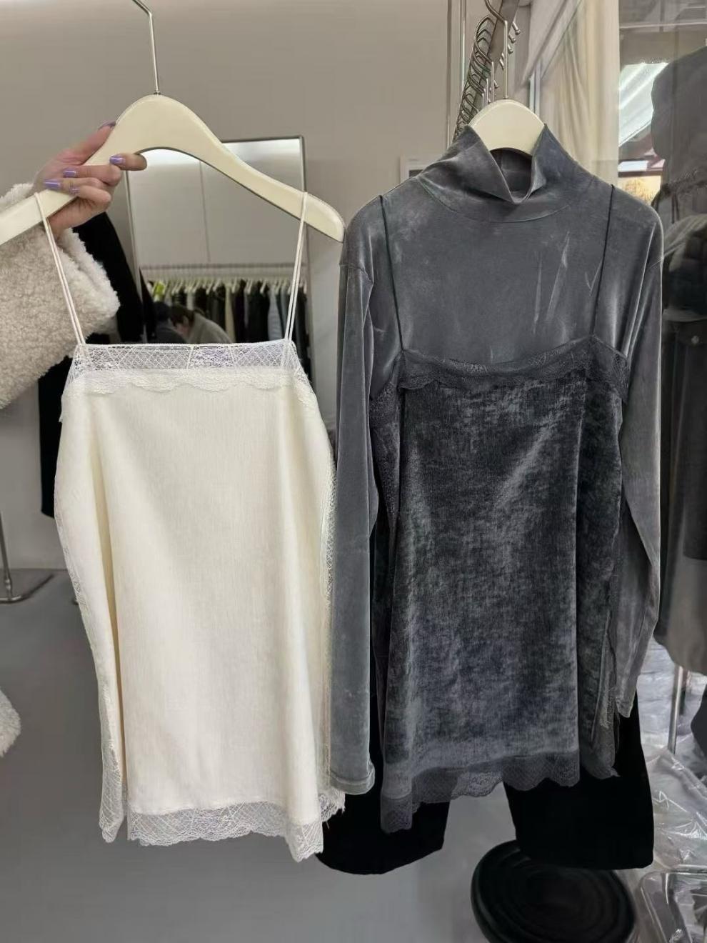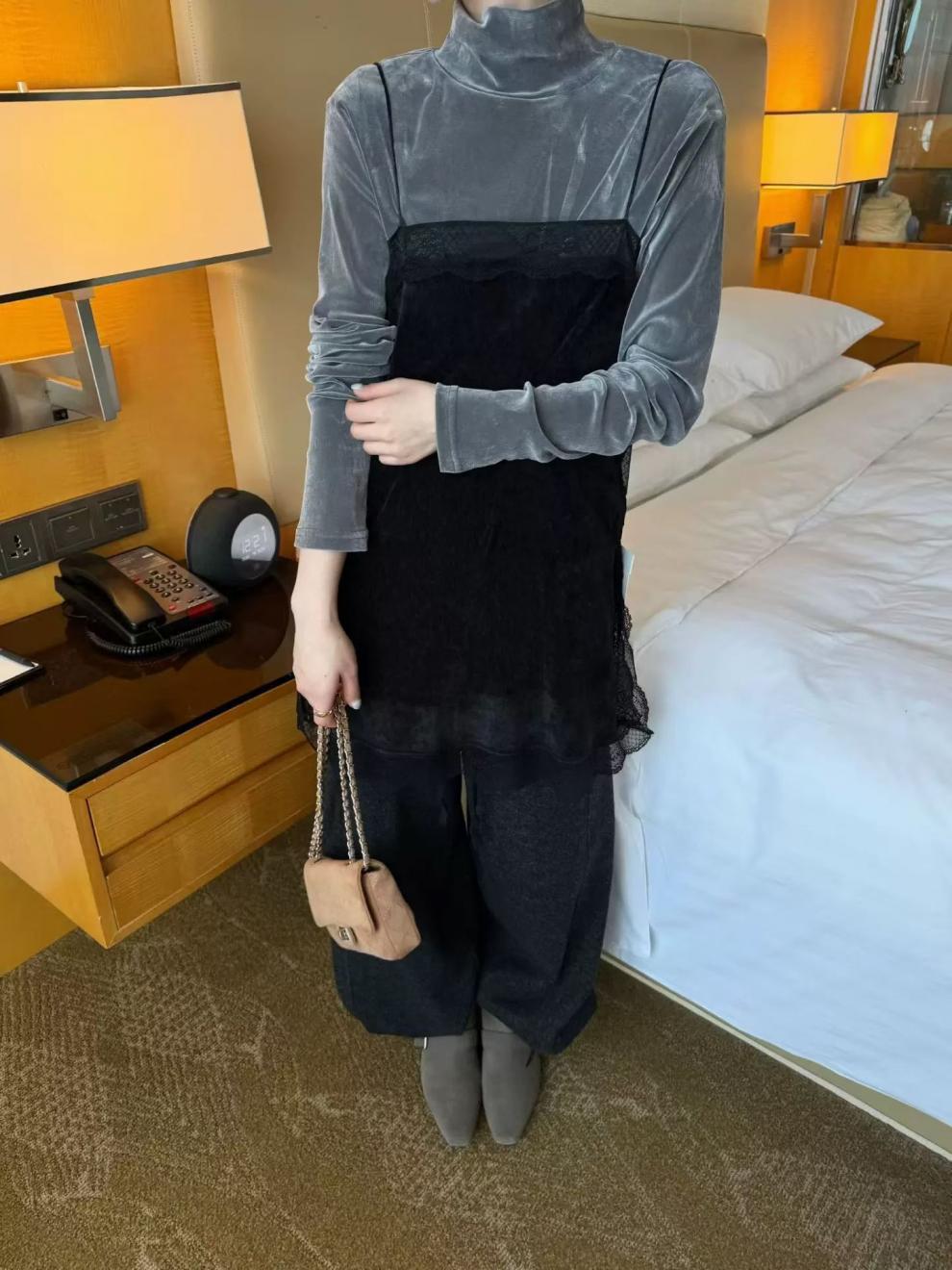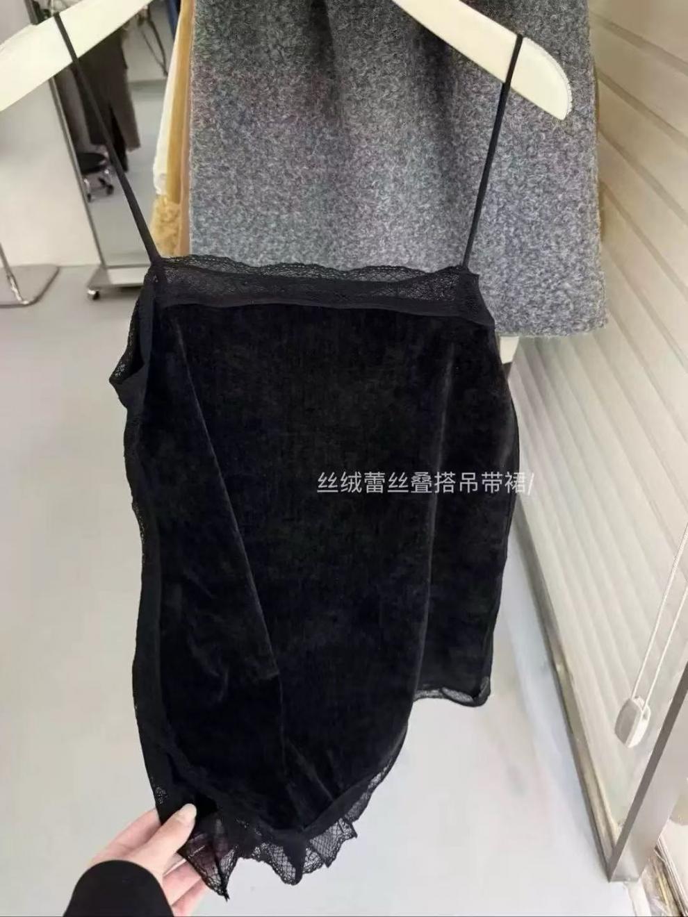韩国女装高货2026早春韩系蕾丝拼接丝绒吊带裙女气质显瘦叠穿无袖