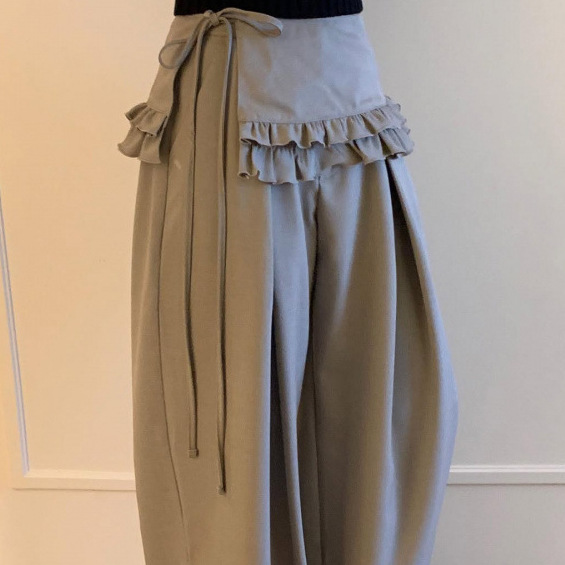 INS韩国东大门女装设计感减龄木耳边绑带屁帘+两穿束脚阔腿裤长裤