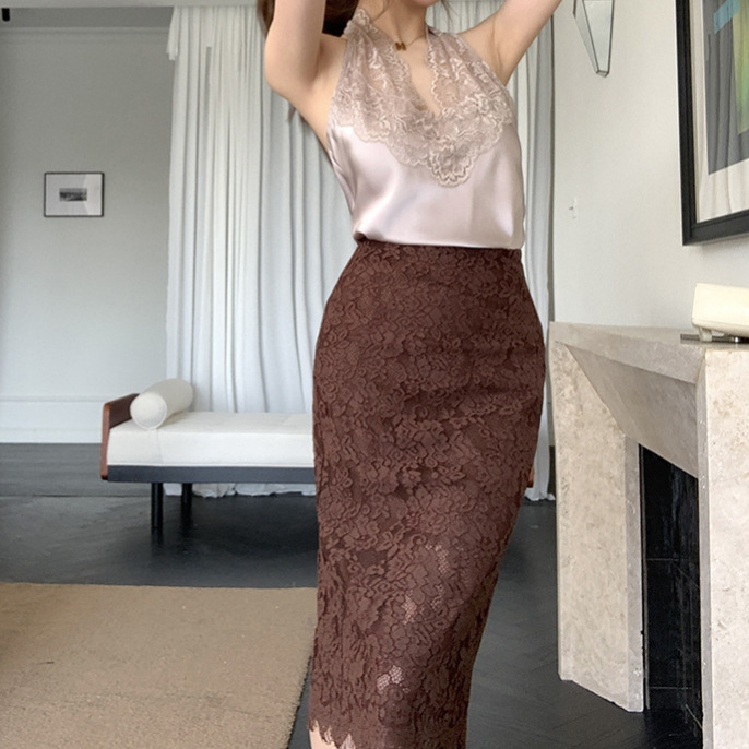 2025年春夏の新デザインのスリムフィットハイウエストヒップスカート、レディースレーススカート、ミドル丈スカート、ハーフスカートの実物写真