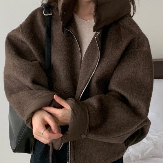 韓国東大門シックな秋冬デザイン、切り替えデザインのフード付き、取り外し可能な紐付き、暖かいショート丈ウールコート(女性用)