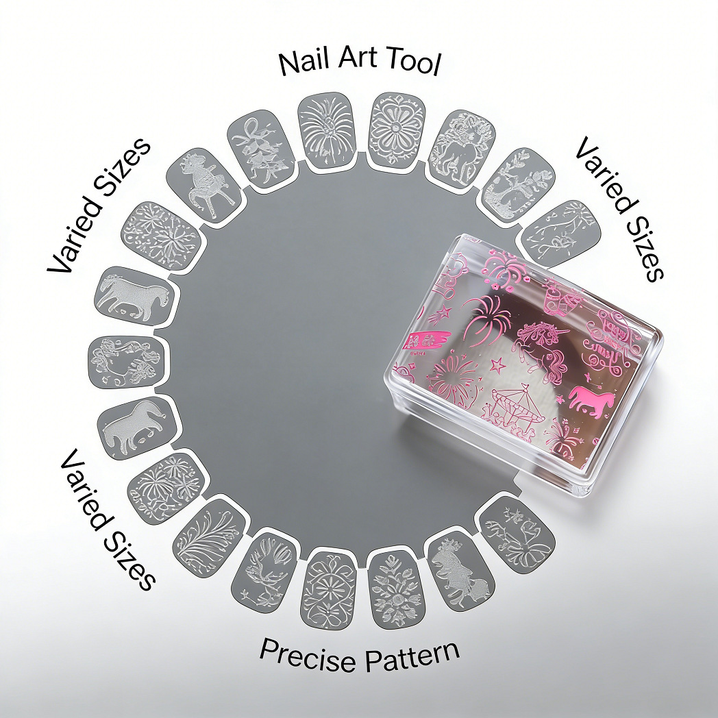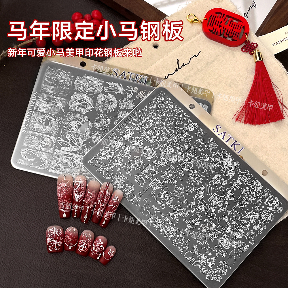 2026马年美甲印花钢板新年小马烟花图案模板指甲转印板美甲店工具