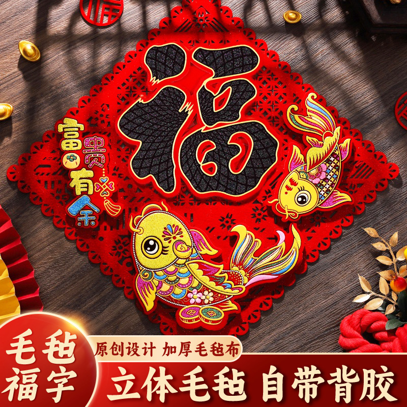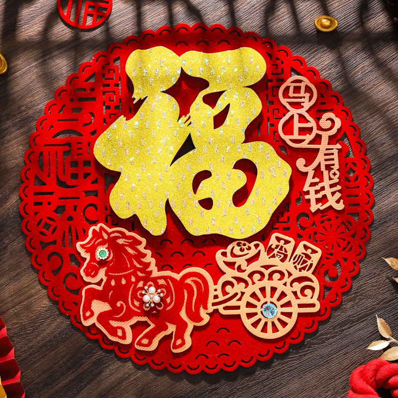 2026年馬年立体フェルト製福文字ドアステッカー、全面粘着式福文字ステッカー、新年飾り、春節用品、年画卸売商品
