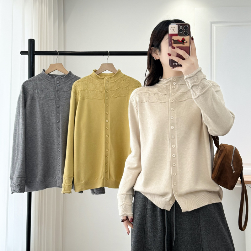 大码女装时尚波浪纽扣设计洋气针织开衫遮肉显瘦半高领毛衣312652