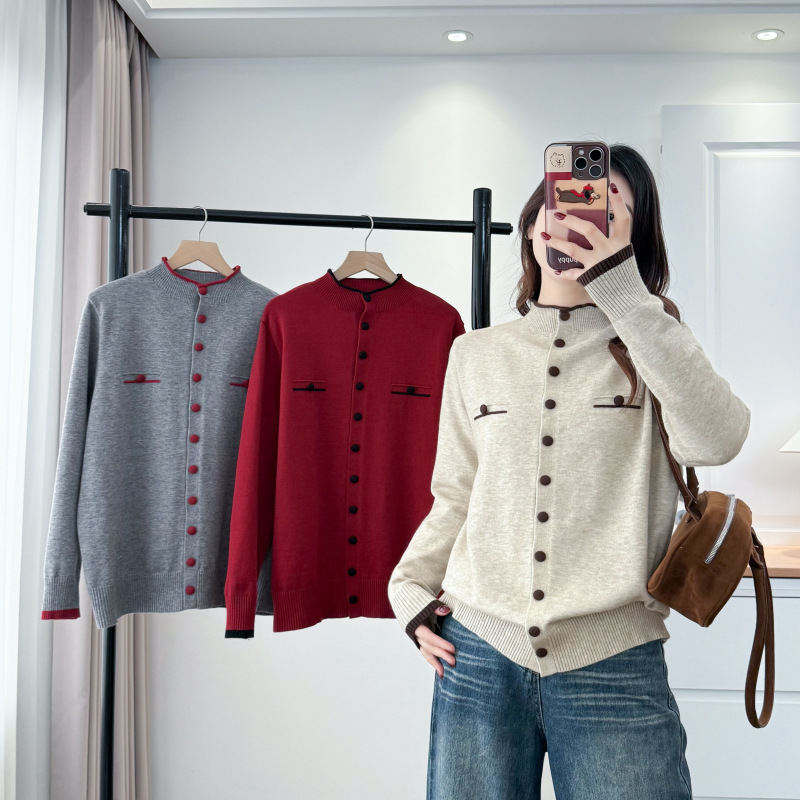 大码女装秋冬款拼色纽扣开衫毛衣宽松遮肉半高领气质针织衫312651
