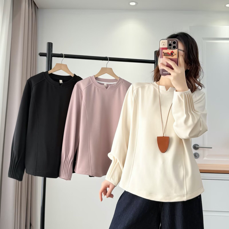 大码女装时尚明线设计袖子褶皱打底衫秋冬宽松休闲外穿上衣12896