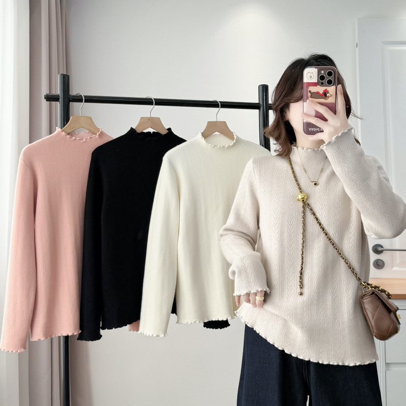 大码女装甜美木耳边半高领肌理感提花加厚一体绒针织衫毛衣732328