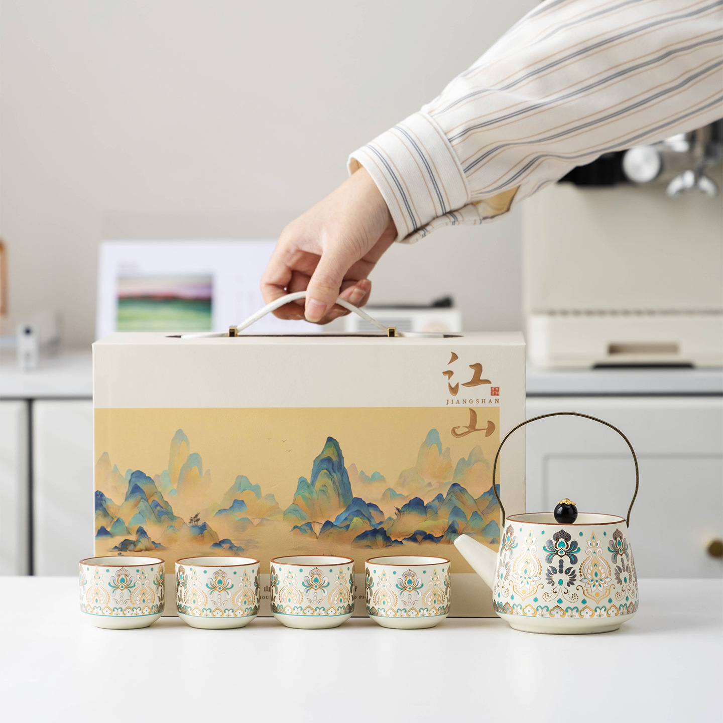国风山水江山礼盒装金银错提梁壶一壶四杯家用送礼茶器可定制logo