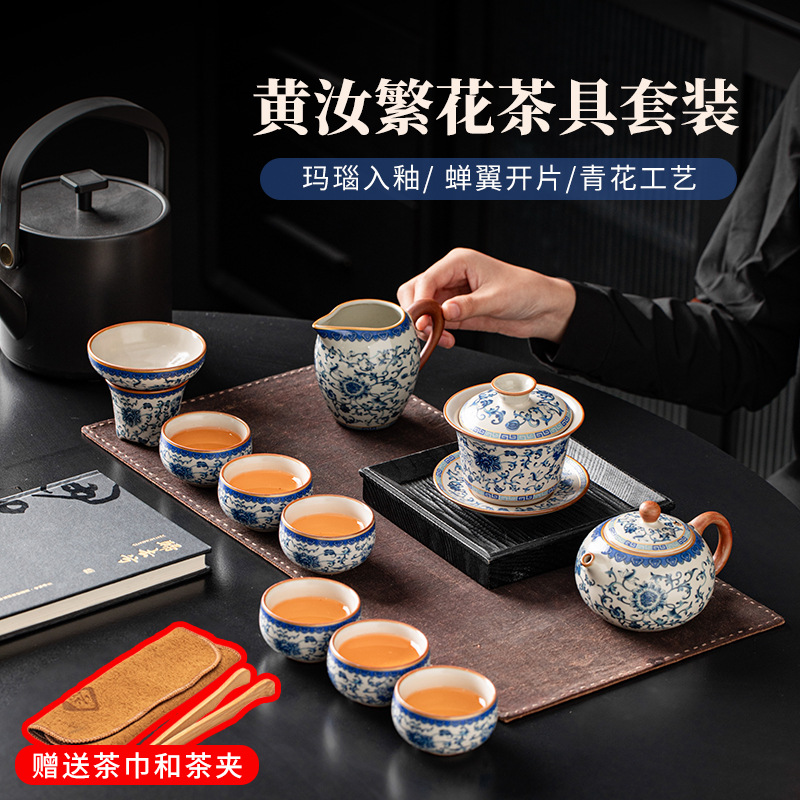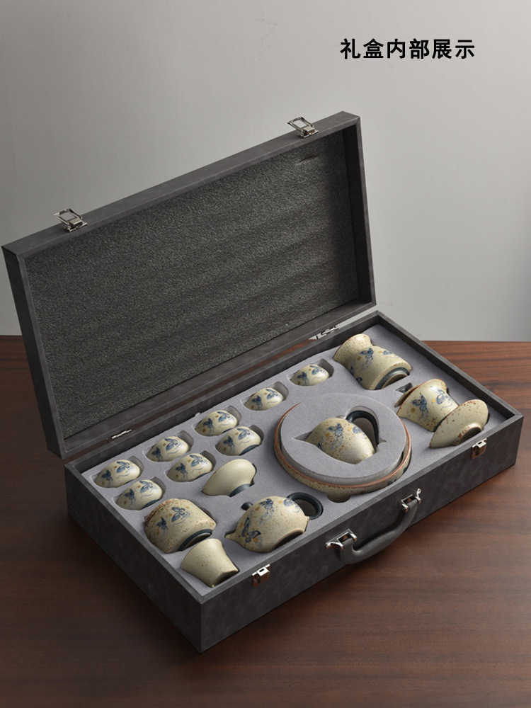 カスタマイズされた青と白の磁器ティーセットギフトボックス 2024 新しいライト高級汝窯カンフーティーポットティーカップセラミックカバーボウル