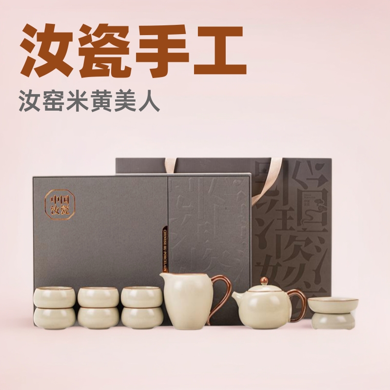 米黄汝窑功夫茶具高档礼盒家用泡茶壶高档茶杯冲茶盖碗陶瓷公道杯