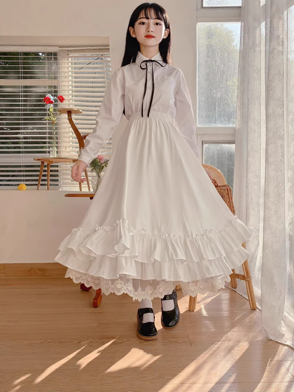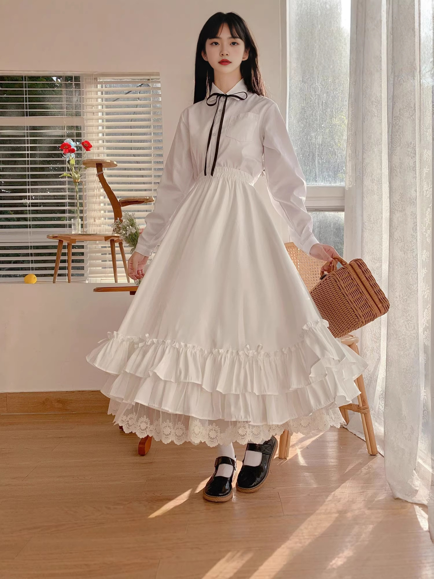 2026日系软妹超仙花边长裙白色仙女裙高腰半身裙女设计感小众裙子