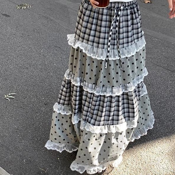 法式花边拼接格纹格子蕾丝蛋糕长裙2026新款设计复古经典半身裙