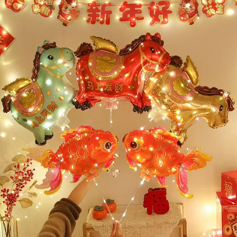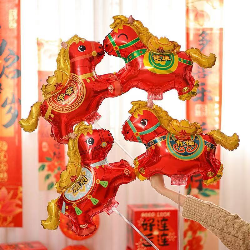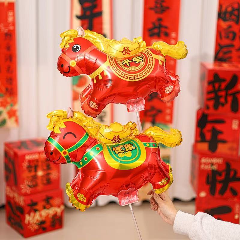 新年卡通夹片气球手持托杆节日马年发财马儿童拉车玩具铝膜摆摊
