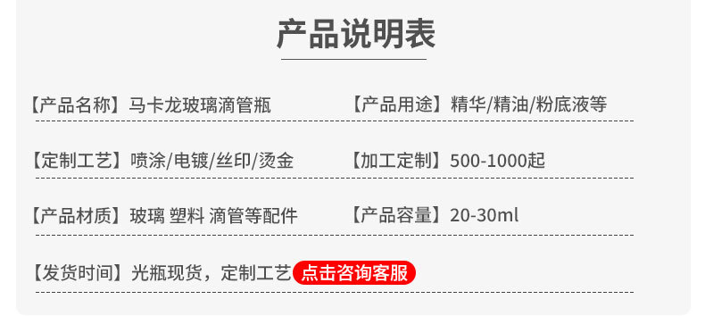 规格型号 20ml;透明款;玻璃,20ml;蒙砂款;玻璃,30ml;透明款;玻璃,30ml;蒙砂款;玻璃